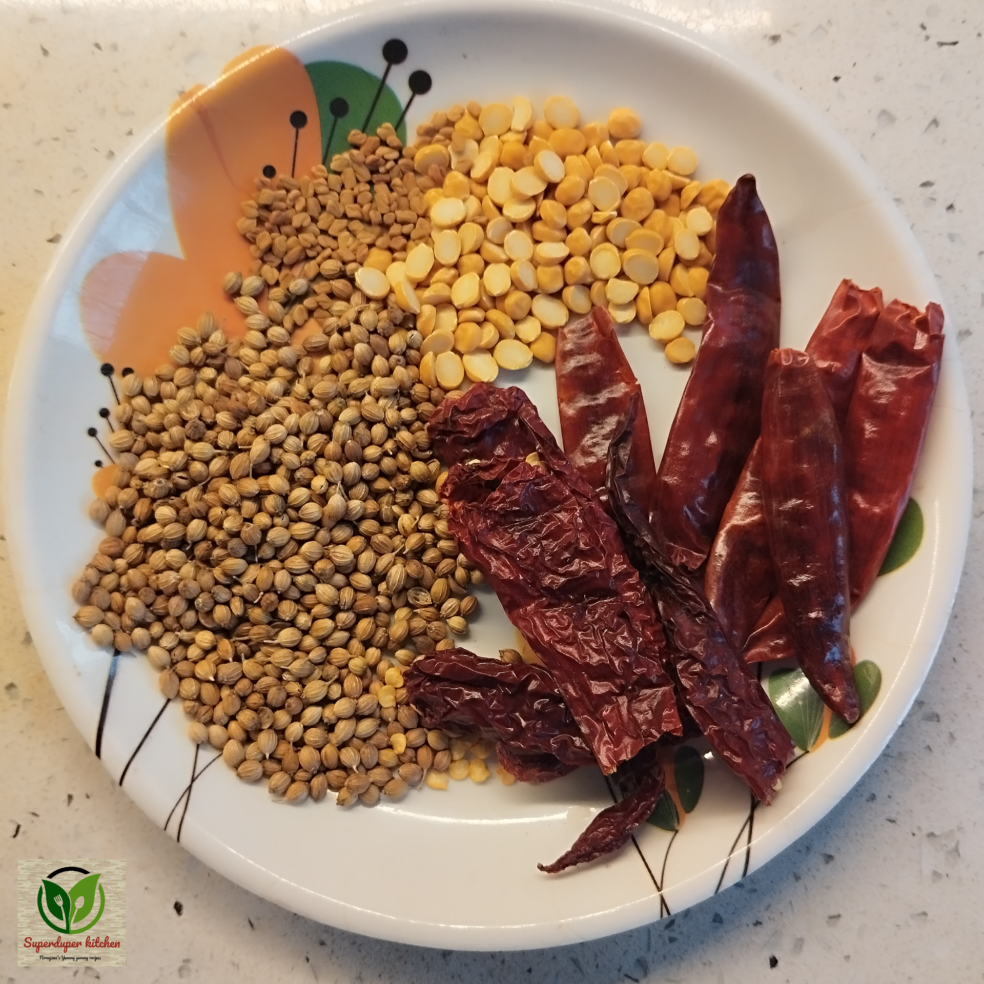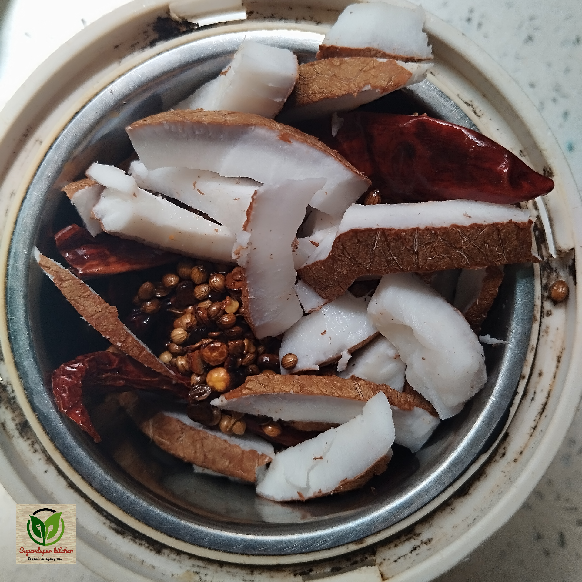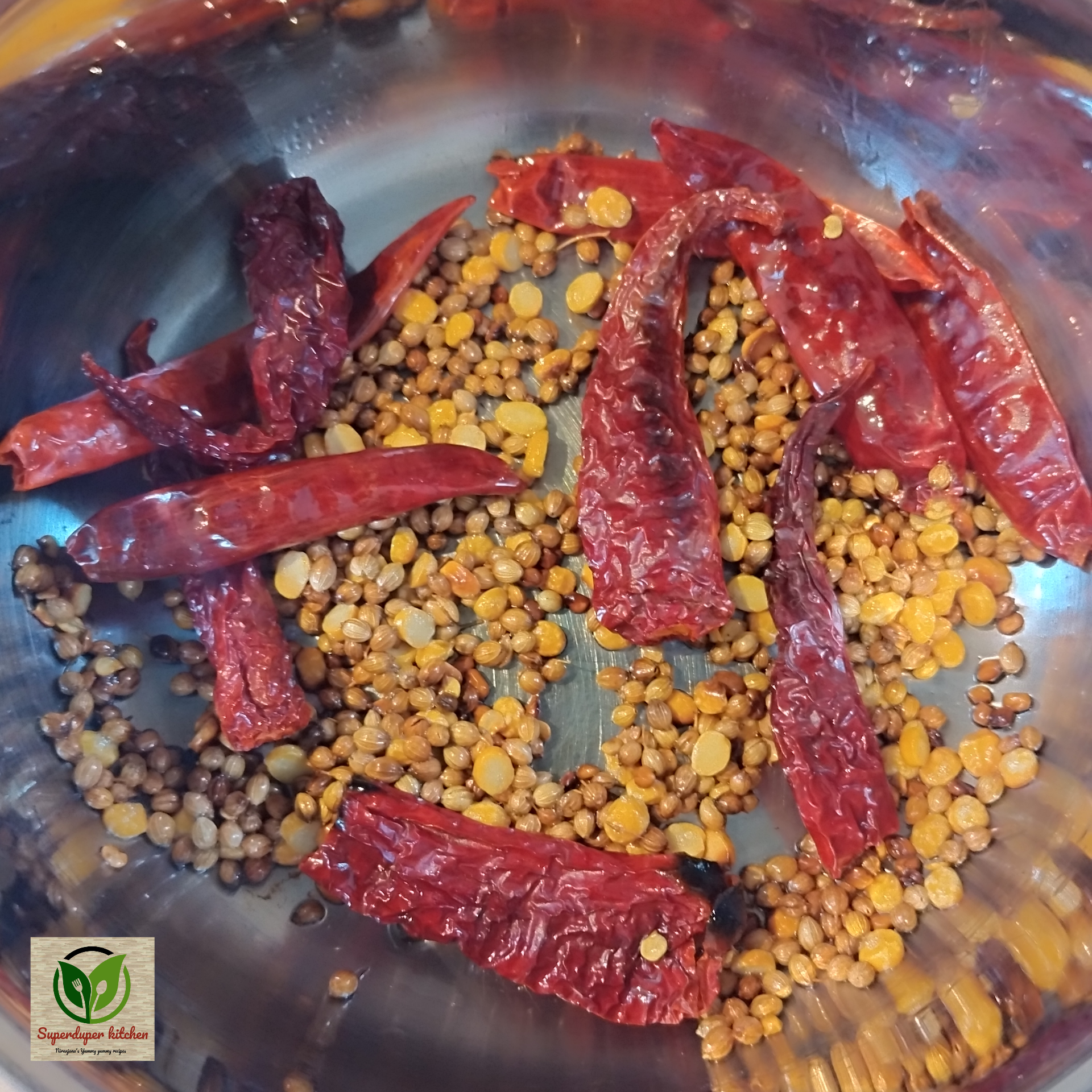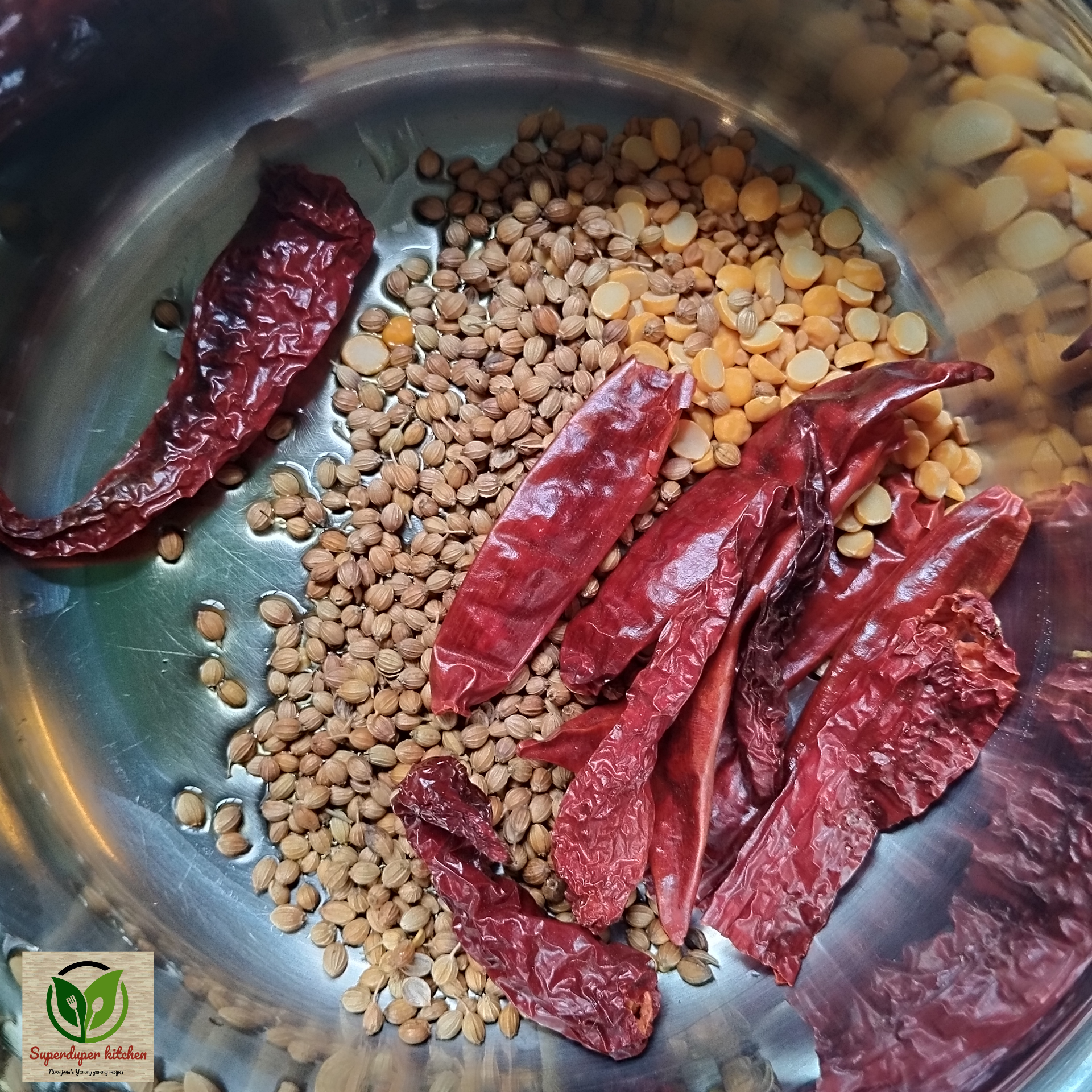 - Roast coriander seeds, channa dal, grated coconut, dry red chilies, and fenugreek seeds until aromatic.