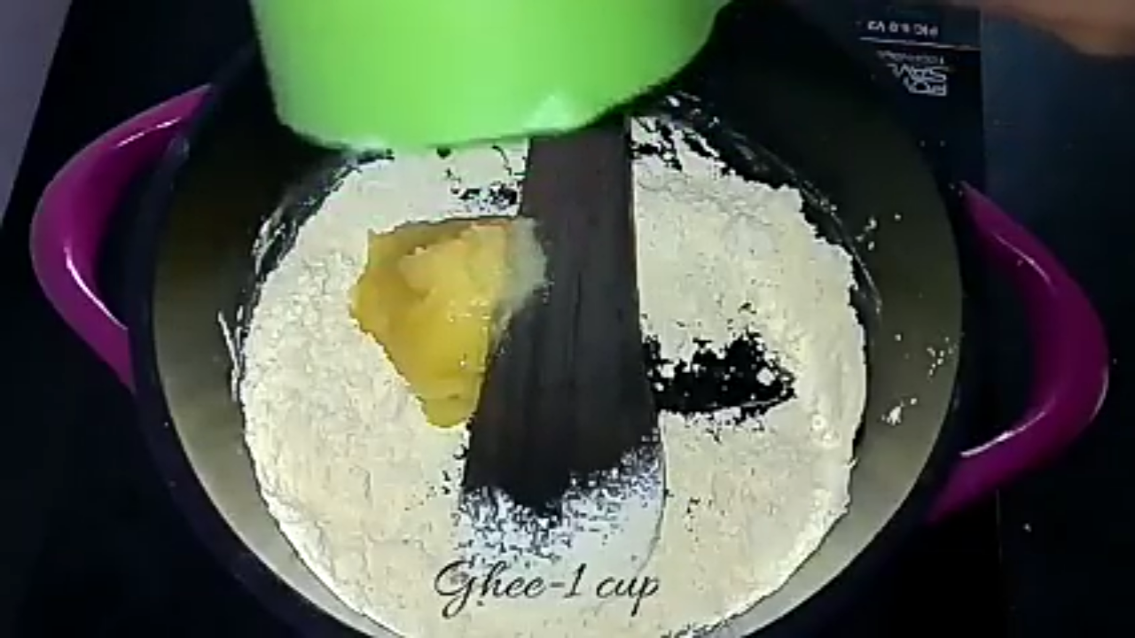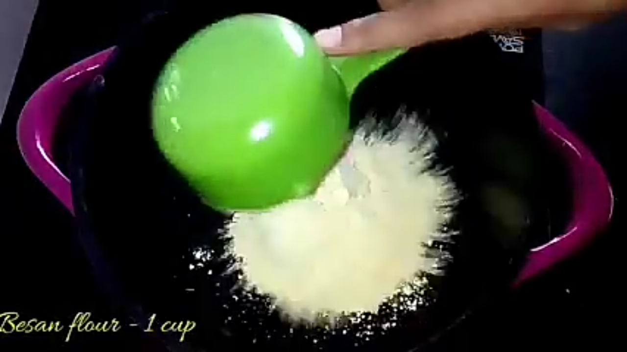 - Take a heavy bottomed pan. Add Besan flour and roast it.