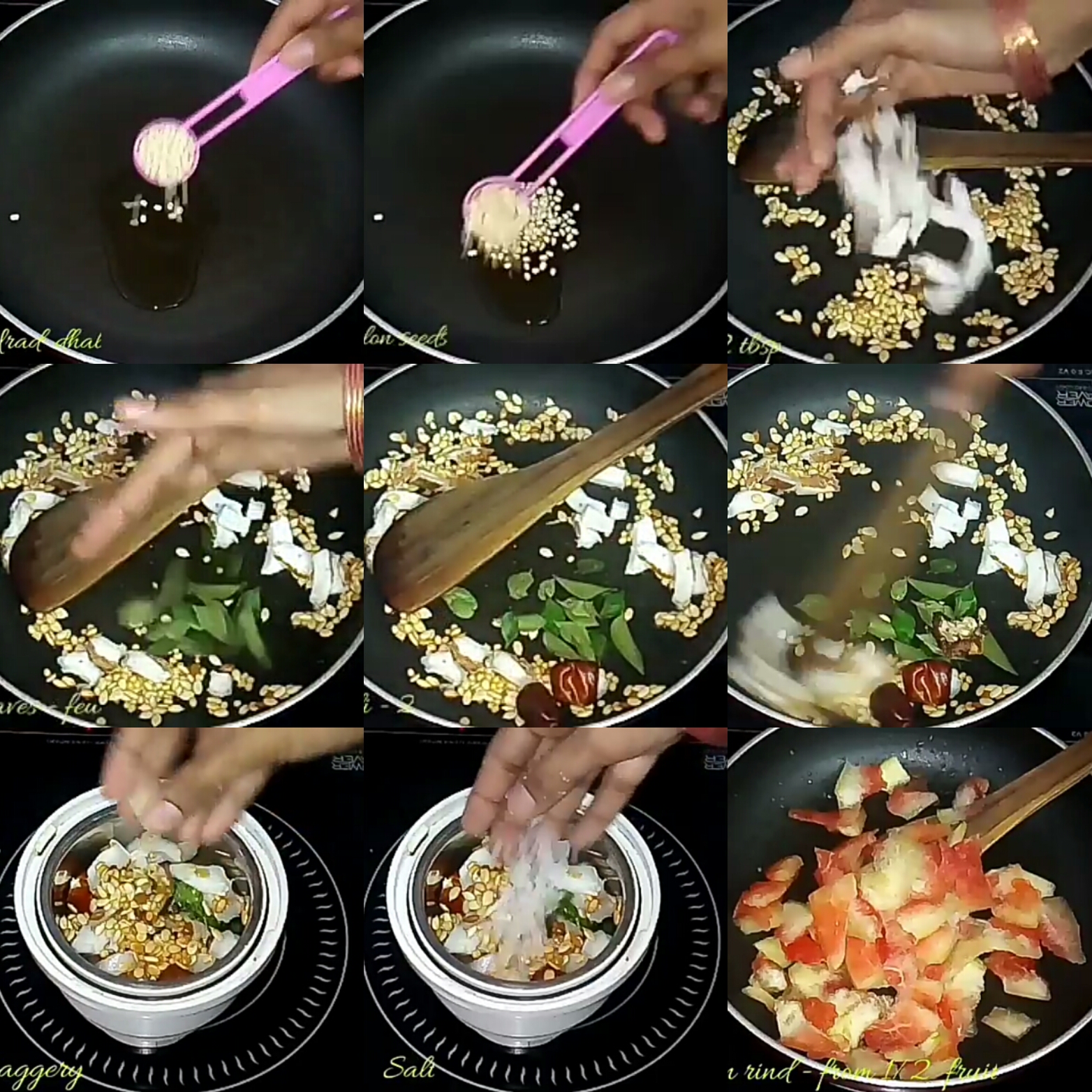 - In a kadai add oil and saute urad dhal and melon seeds. Saute until they turn golden brown in colour.