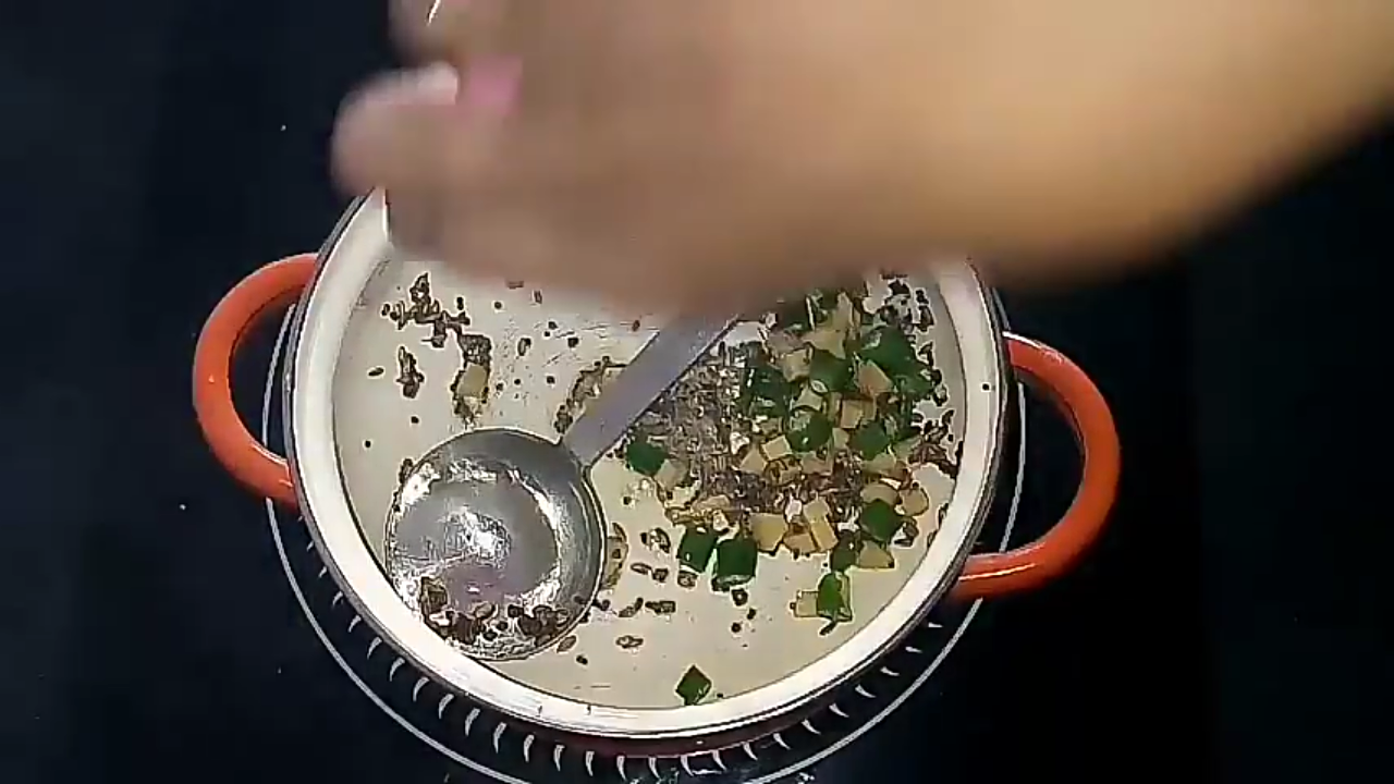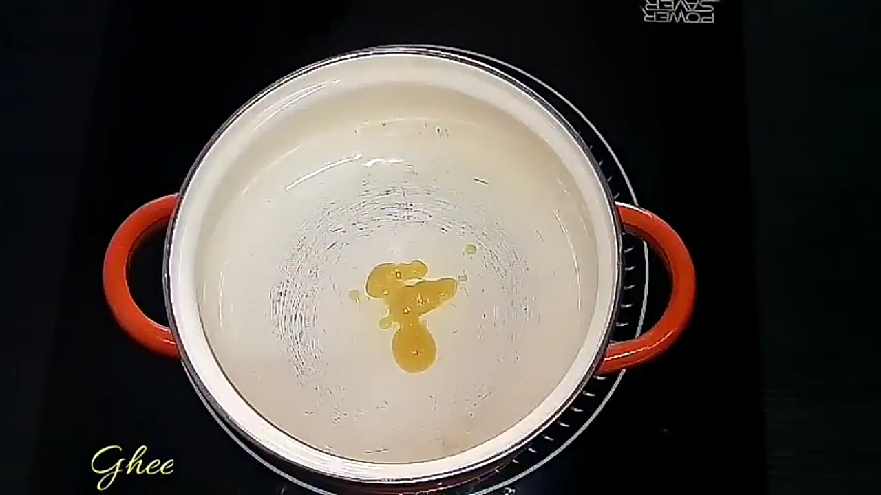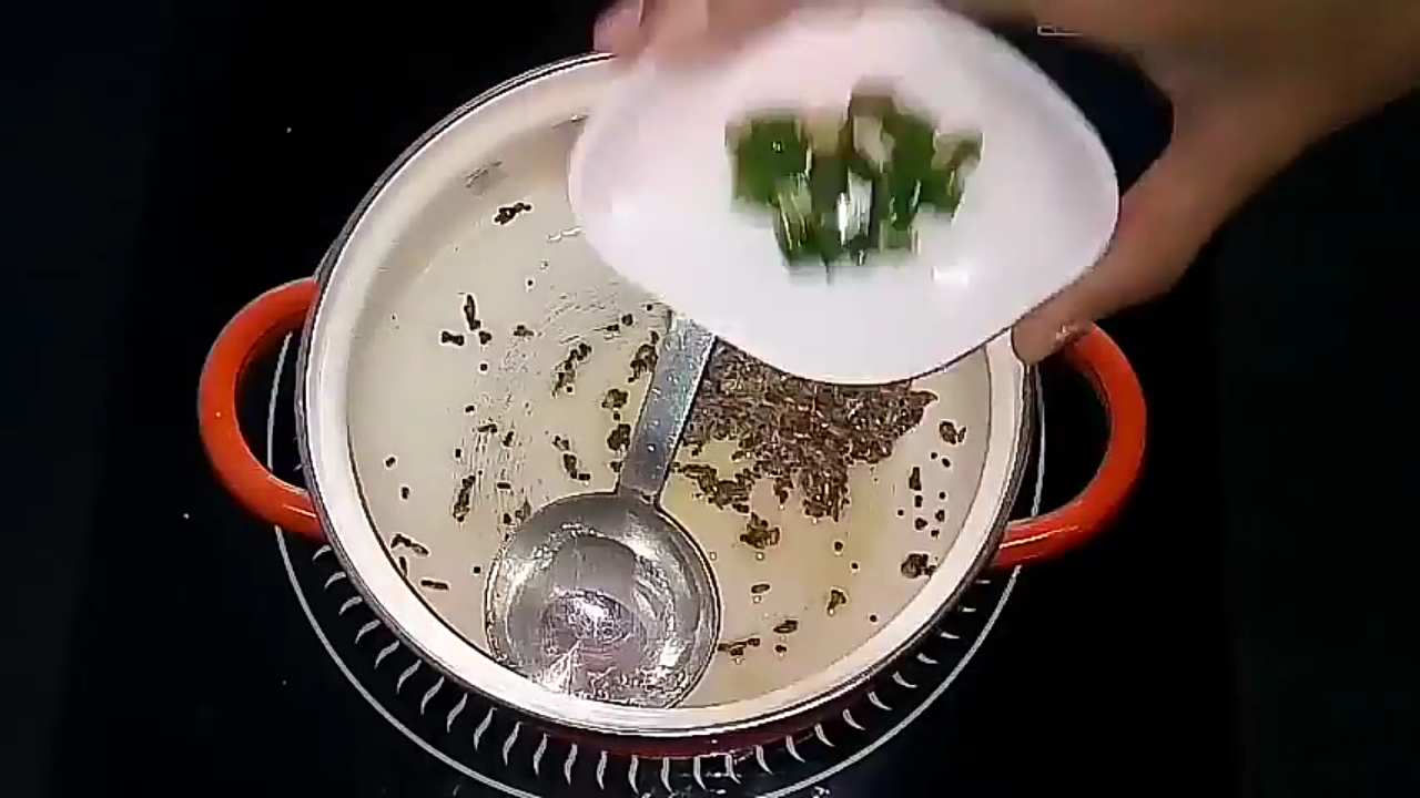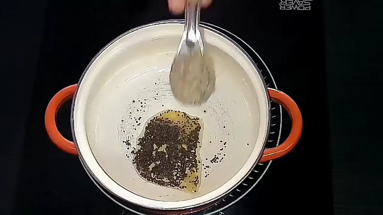 - In a pan, add ghee and splutter mustard seeds. Once they crack, add the cumin seeds and saute until they are fried popularly.