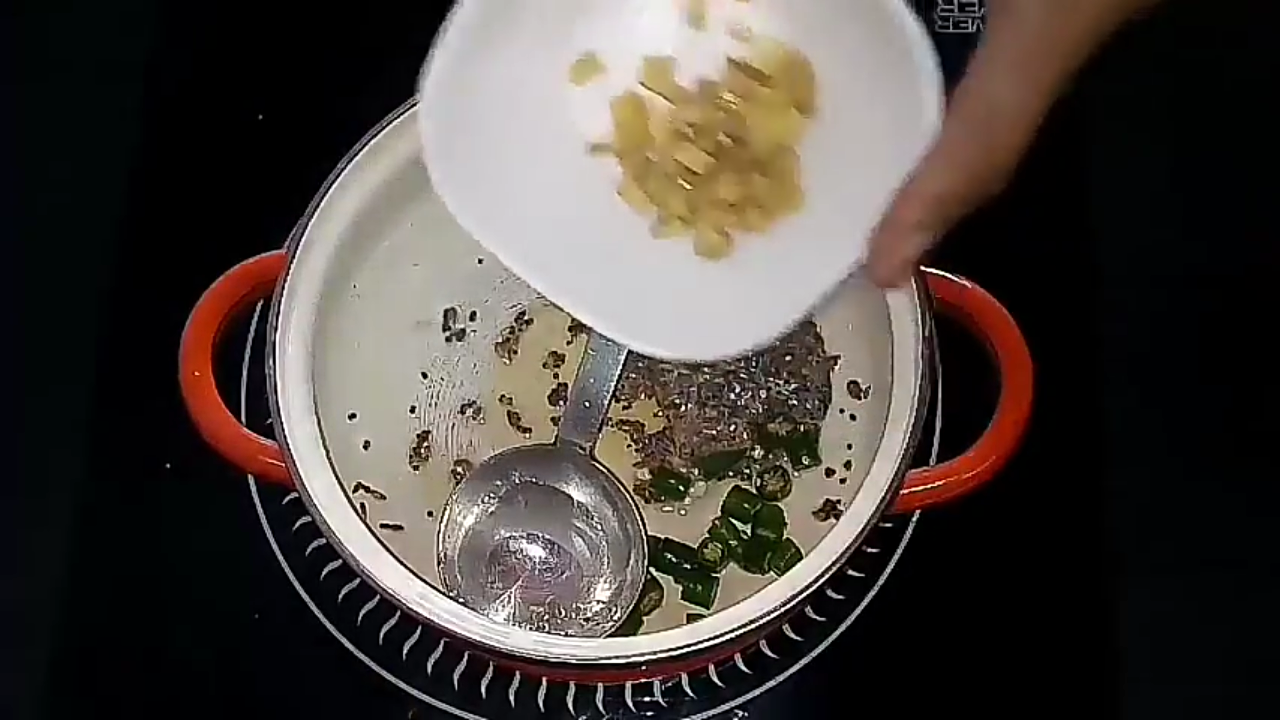 - Then add chopped green chillies, ginger, curry leaves and saute for a minute.