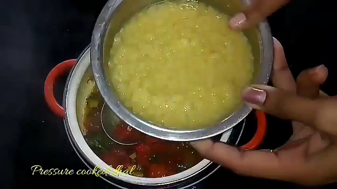- Once the tomatoes are cooked, add moong dhal with some water.