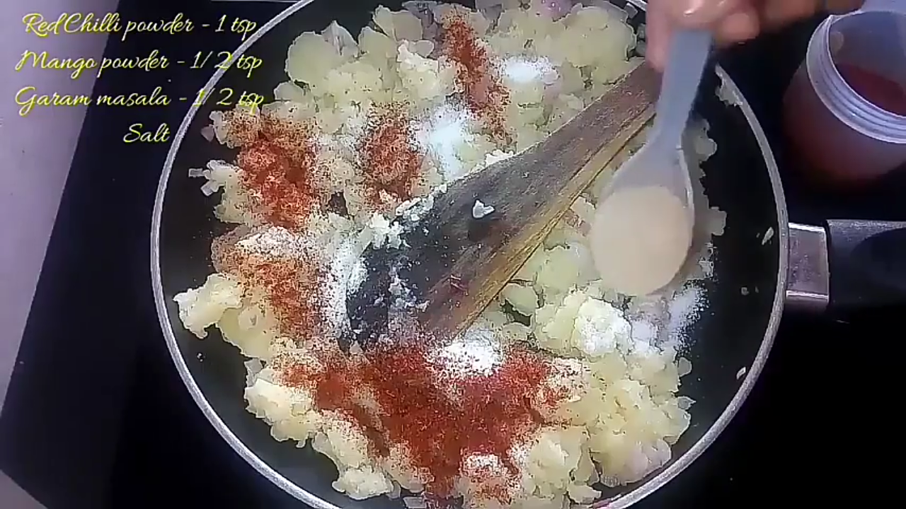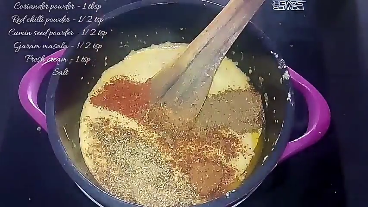 - Add garam masala, red chilli powder, mango powder, turmeric powder, salt.