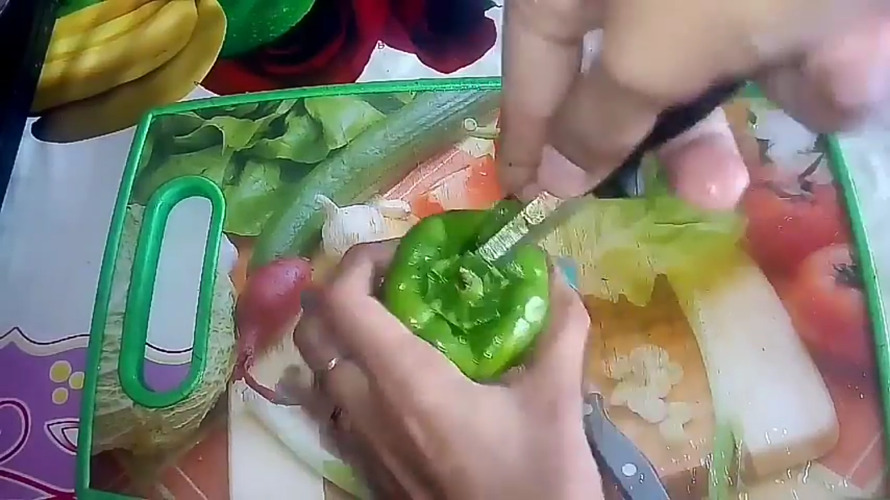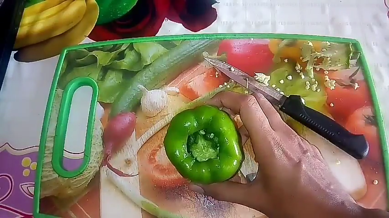 - With the knife, slowly remove the stem and seeds completely. Also remove the white portion in the capsicum.