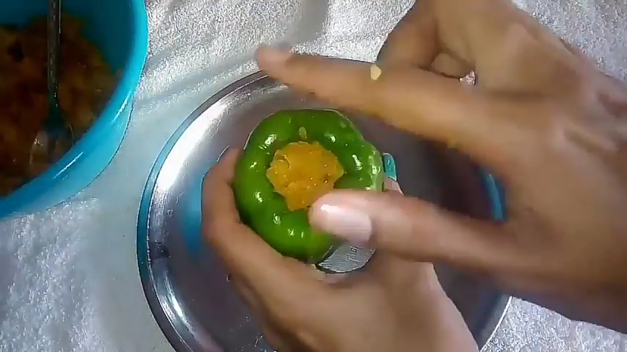 - Keep the capsicum upside down and fry it first. Then slowly fry it on all the sides.