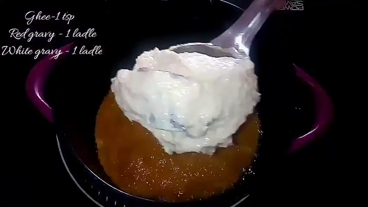 - In a pan add ghee, red gravy, white gravy and cook for a minute.