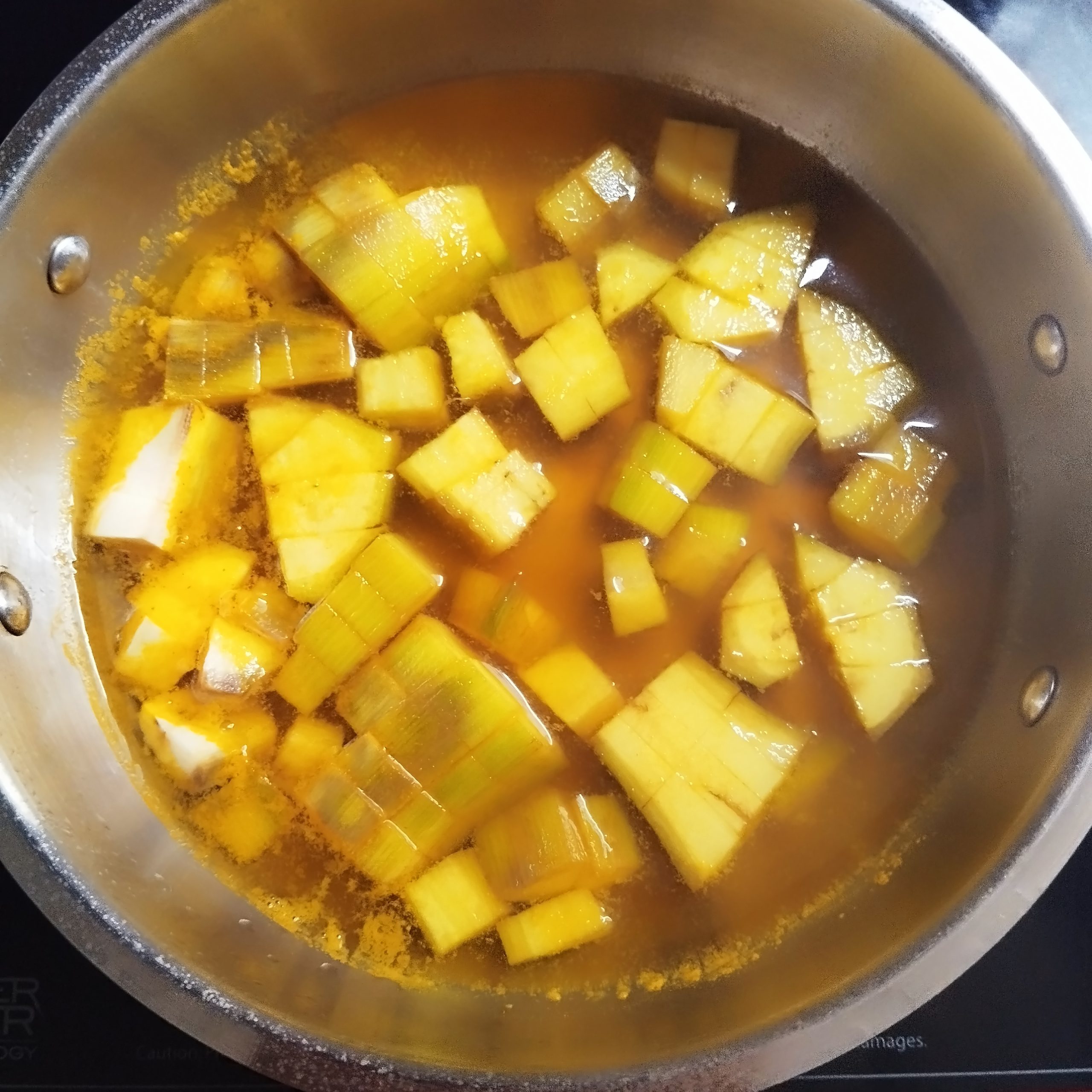 - Next day drain the water and pressure cook the plantain and cowpeas with little water, salt and turmeric powder.