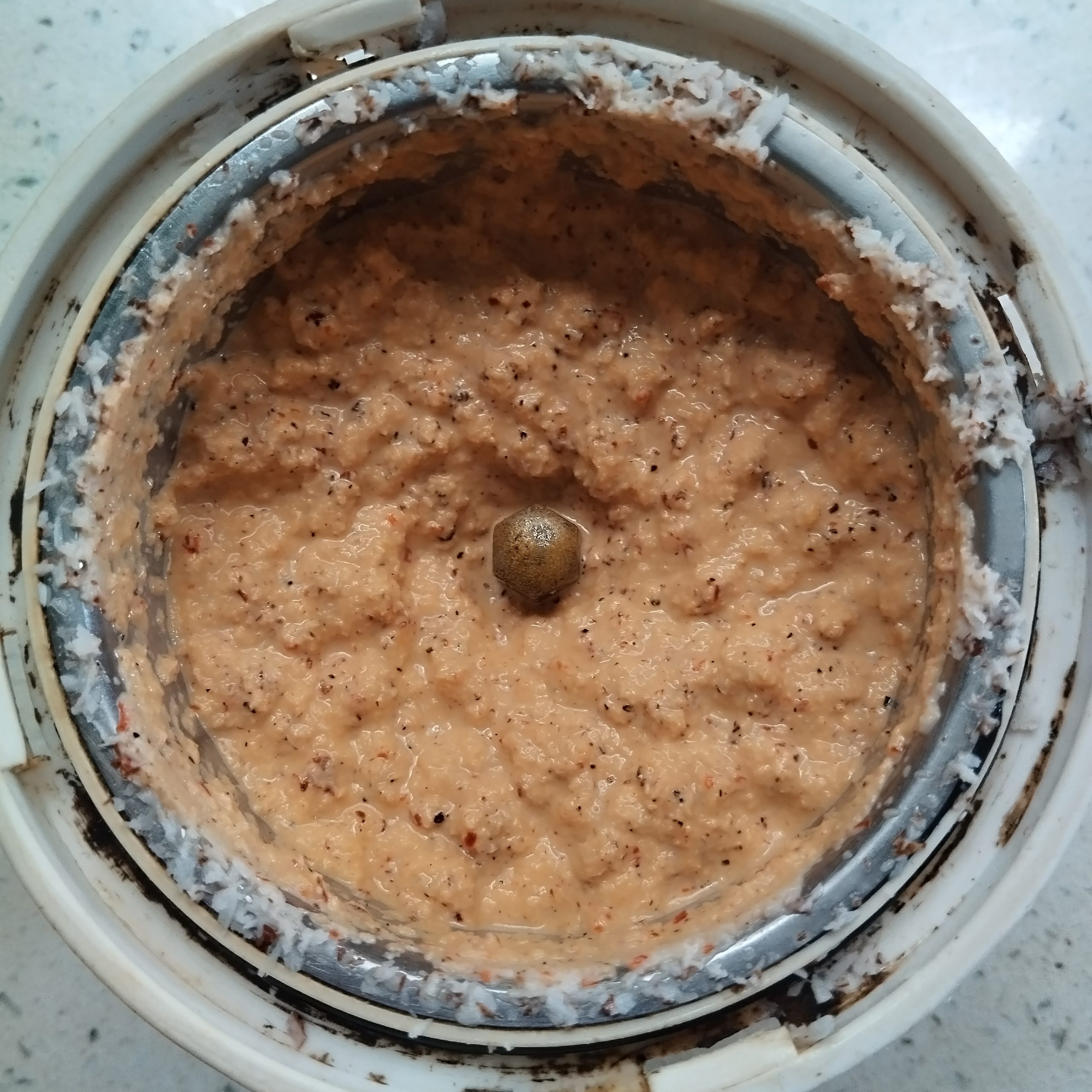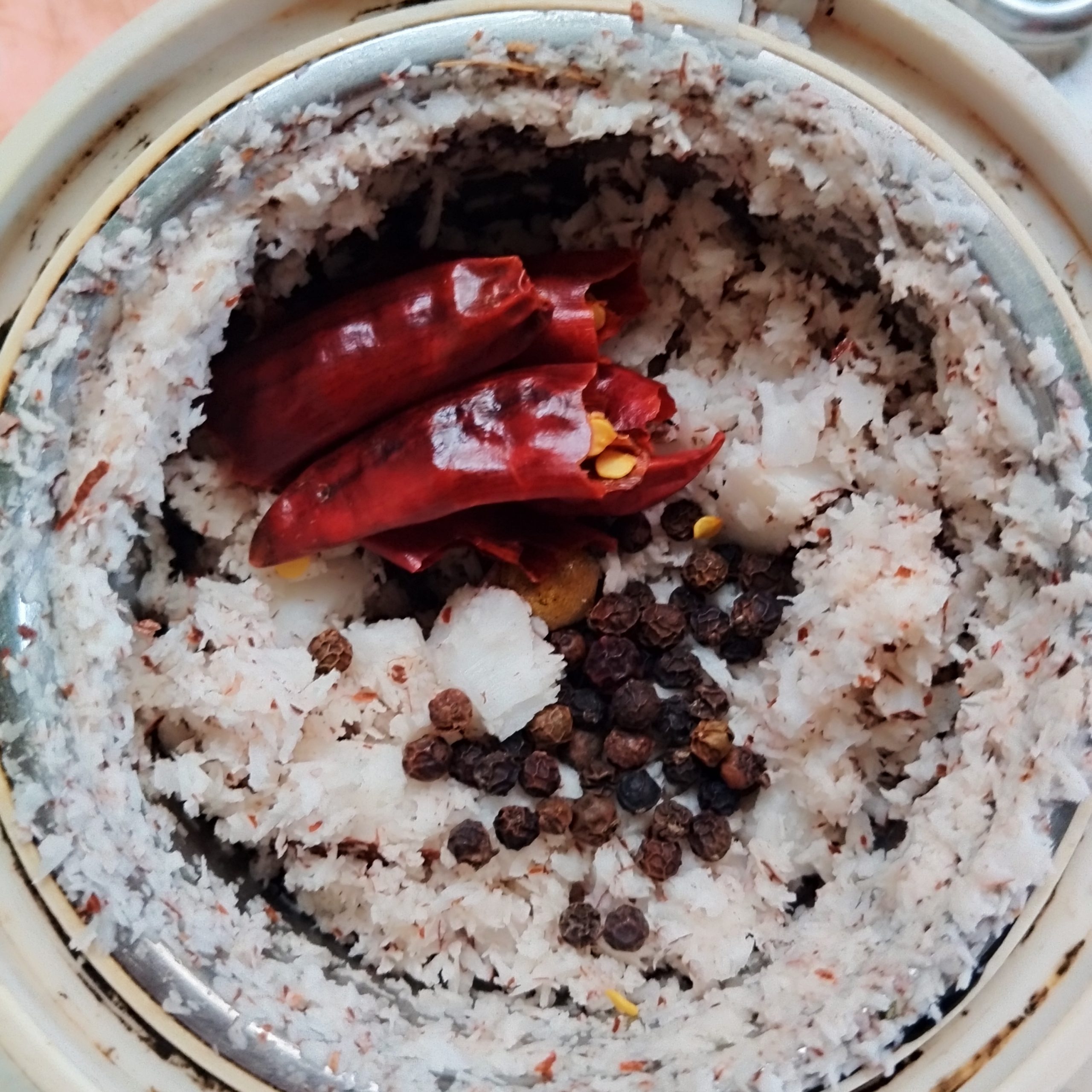 - Grind pepper, red chilly, grated coconut with little water and keep aside.