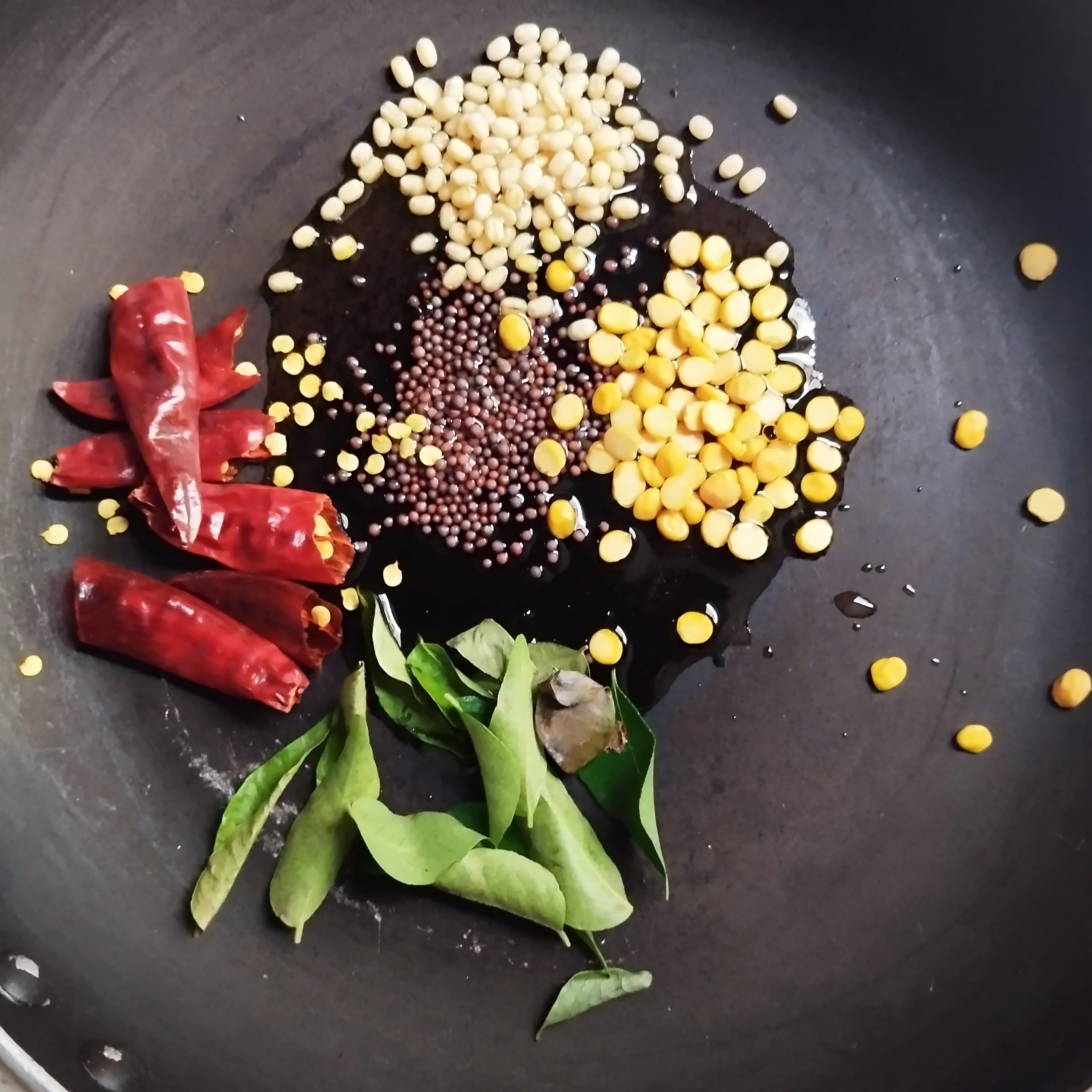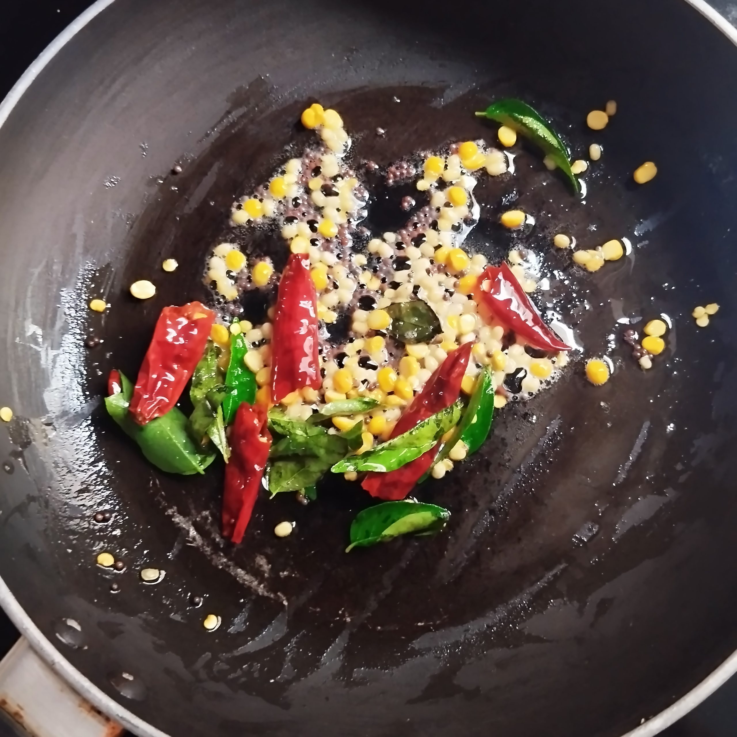 - Finally in another kadai/pan add 2 tsp coconut oil, and splutter mustard seeds, channa dhal, urad dhal and curry leaves.