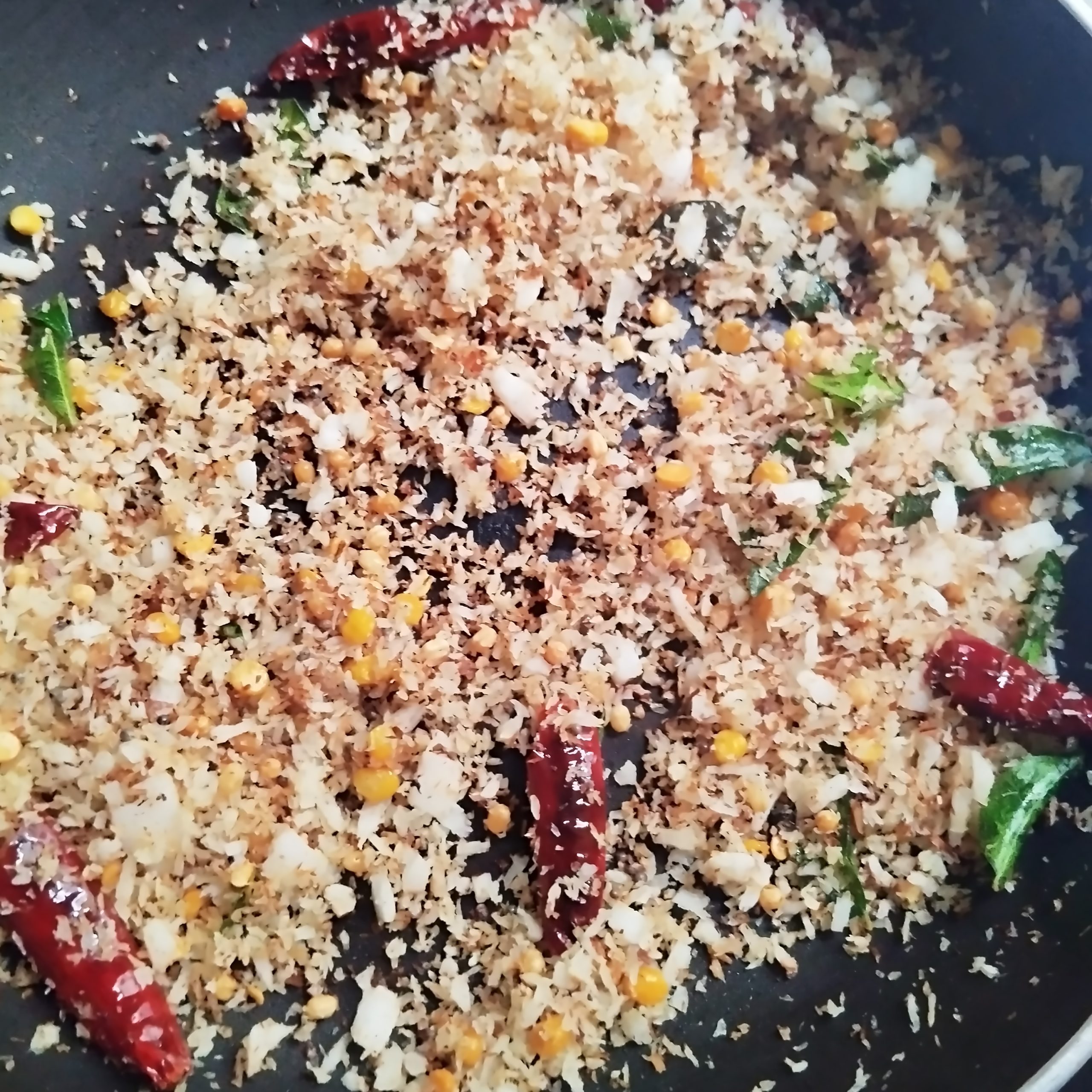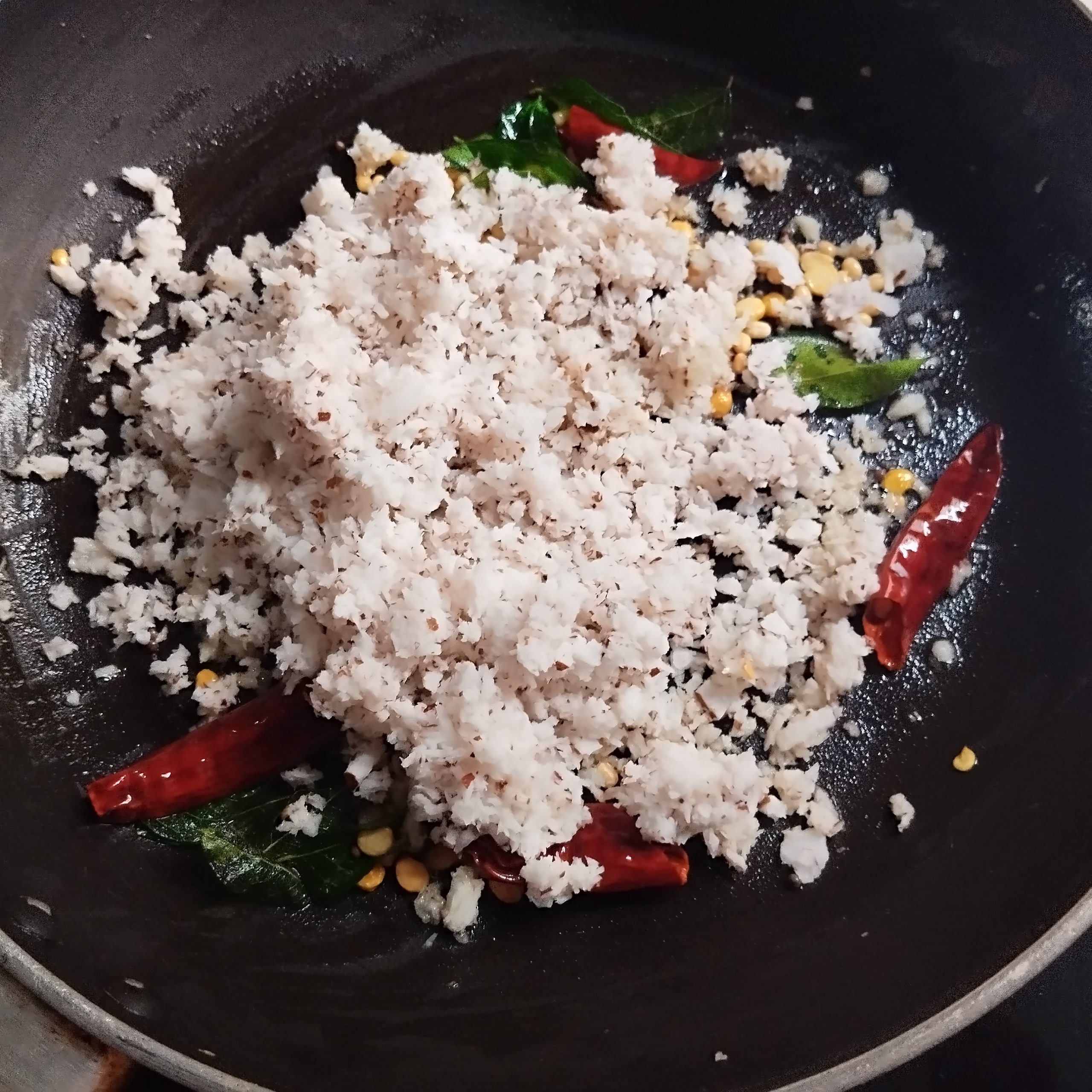 - Once they crack, add the grated coconut and fry until they turn golden brown or until you feel the smell of the coconut.