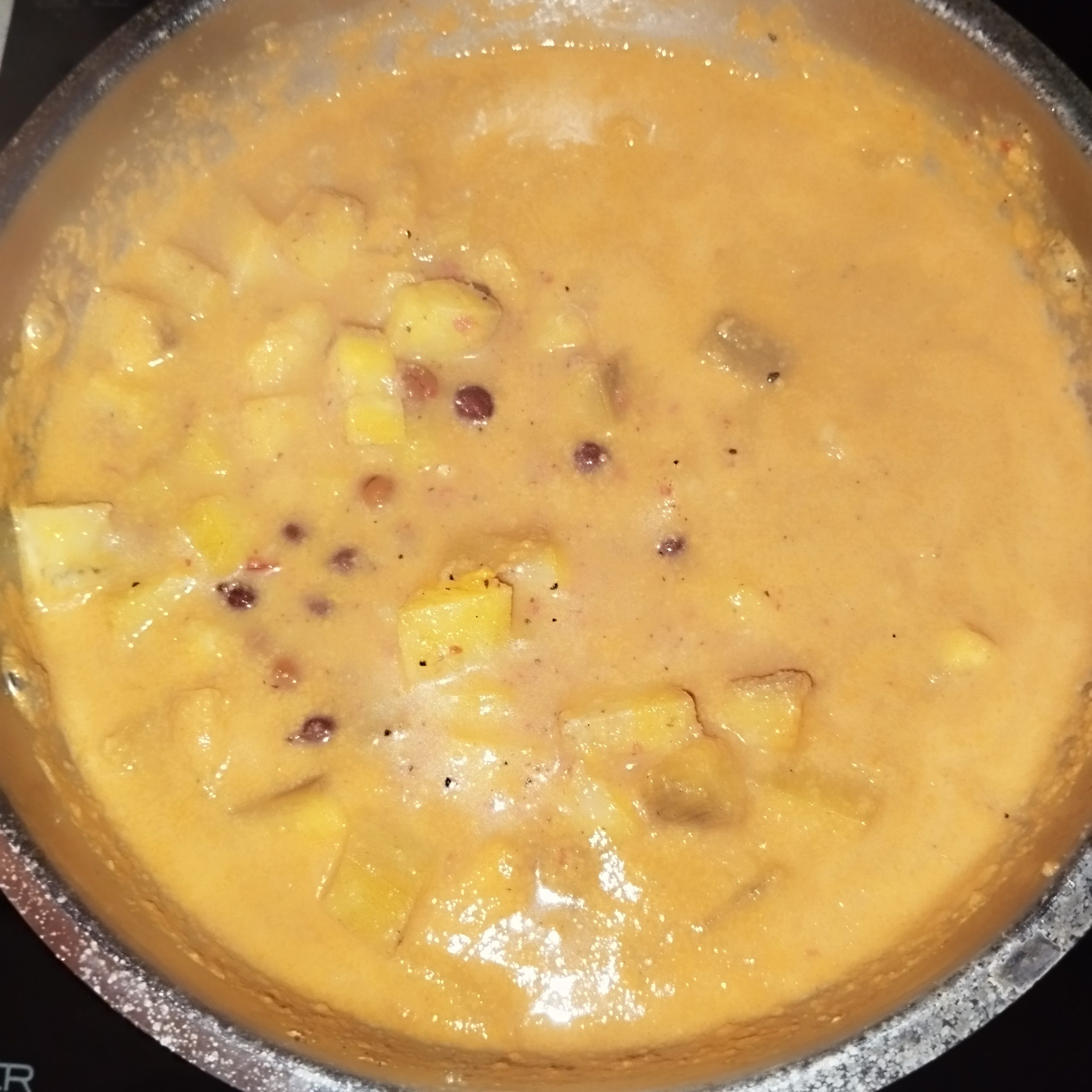 This hearty curry is made by cooking raw banana along with black chickpeas, and is enhanced with roasted coconut, which gives it a deep, aromatic flavor. The roasted coconut paste adds a creamy texture to the curry, making it a satisfying dish. While the primary combination in this recipe is plantain and black chickpeas, you can also prepare it with other variations. Some are plantain with cowpeas, plantain with chickpeas, yam with chickpeas, or even a combination of plantain, potato, and cowpeas. This flexibility makes the dish highly adaptable based on available ingredients.