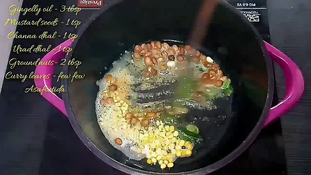 - In a heavy bottomed vessel, add oil and splutter mustard seeds. Once they crack add channa dhal, urad dhal, groundnuts, curry leaves, asafoetida and fry till golden brown.