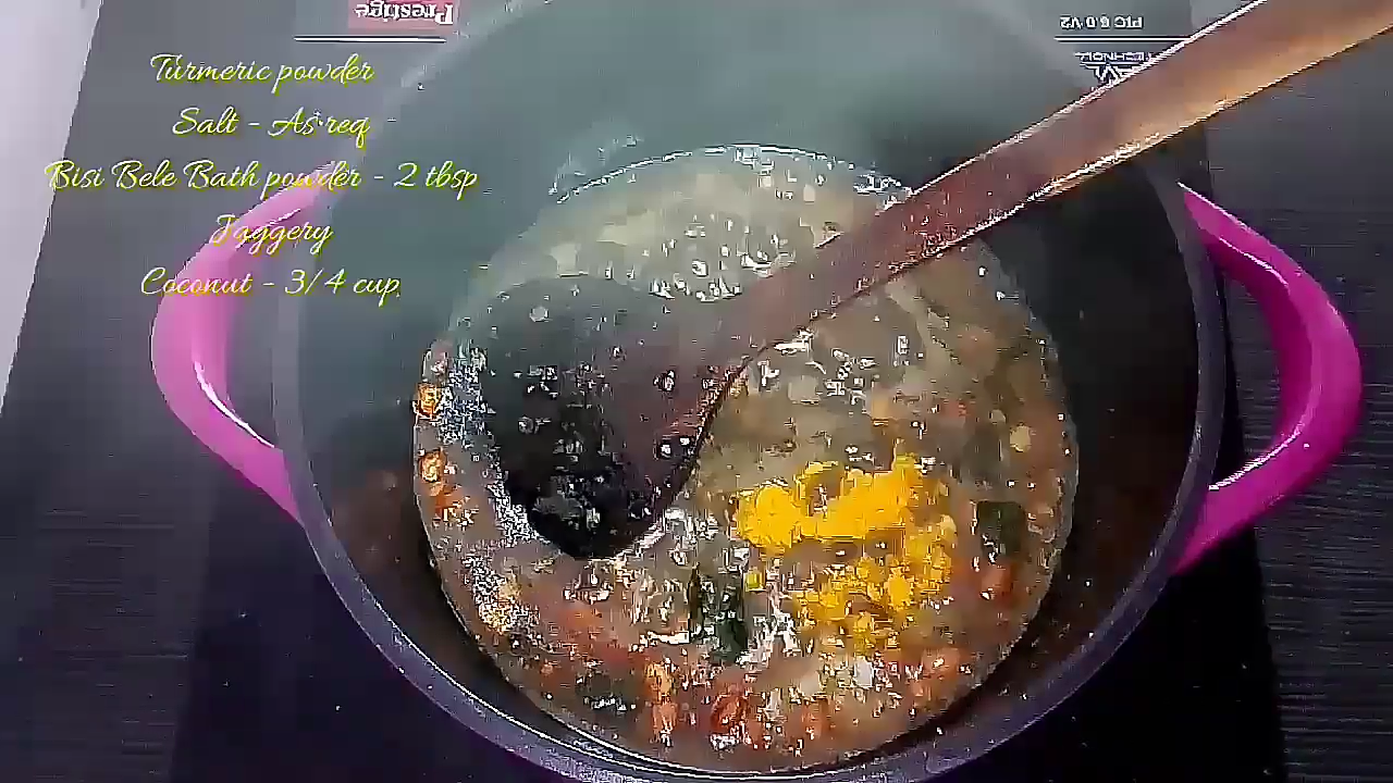 - Then add water, turmeric powder, salt, bisi-bele-bath powder and allow it to boil again.