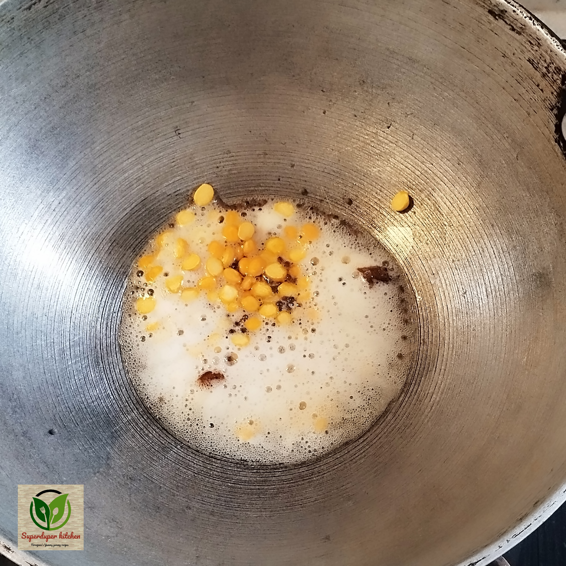 Heat oil in a kadai. Add mustard seeds and allow them to splutter. Add urad dal and chana dal. Sauté until golden brown.