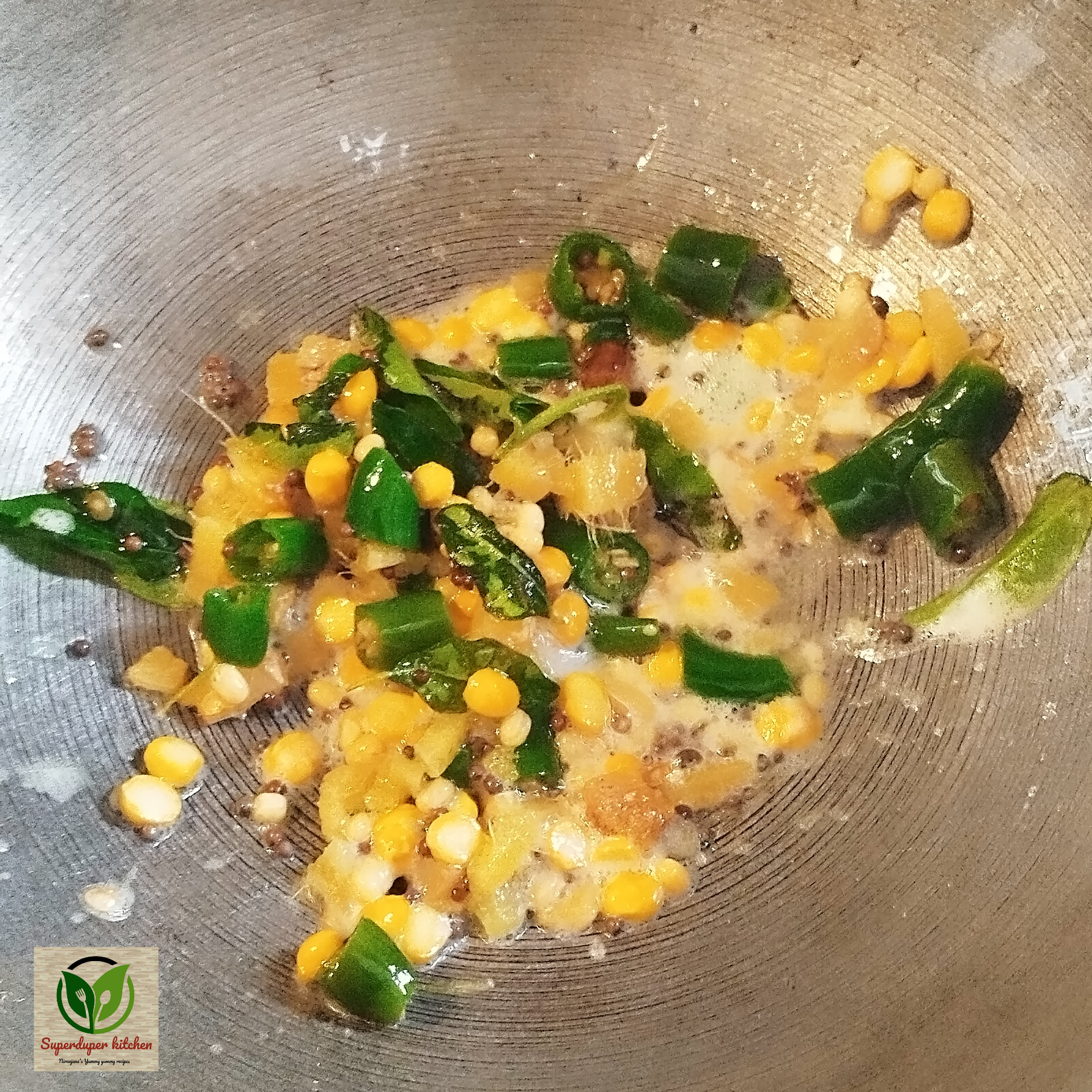 - Toss in chopped green chilies, curry leaves, asafoetida, and salt. Sauté for about 30 seconds.