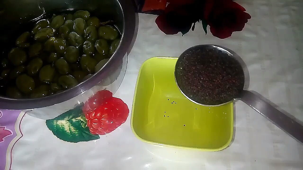 - At this point of time take a small ladle of mustard seeds, add the salt water from mangoes and soak the mangoes for 6 hours.