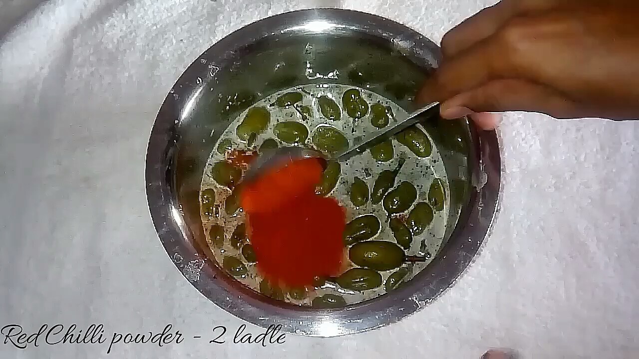 - Finally add two ladles of red chilli powder and mix well.