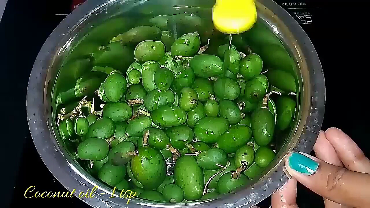 - Here I have used coconut oil, but we can also use gingelley oil + Castor oil. This makes the mangoes to absorb the salt and spiciness better.