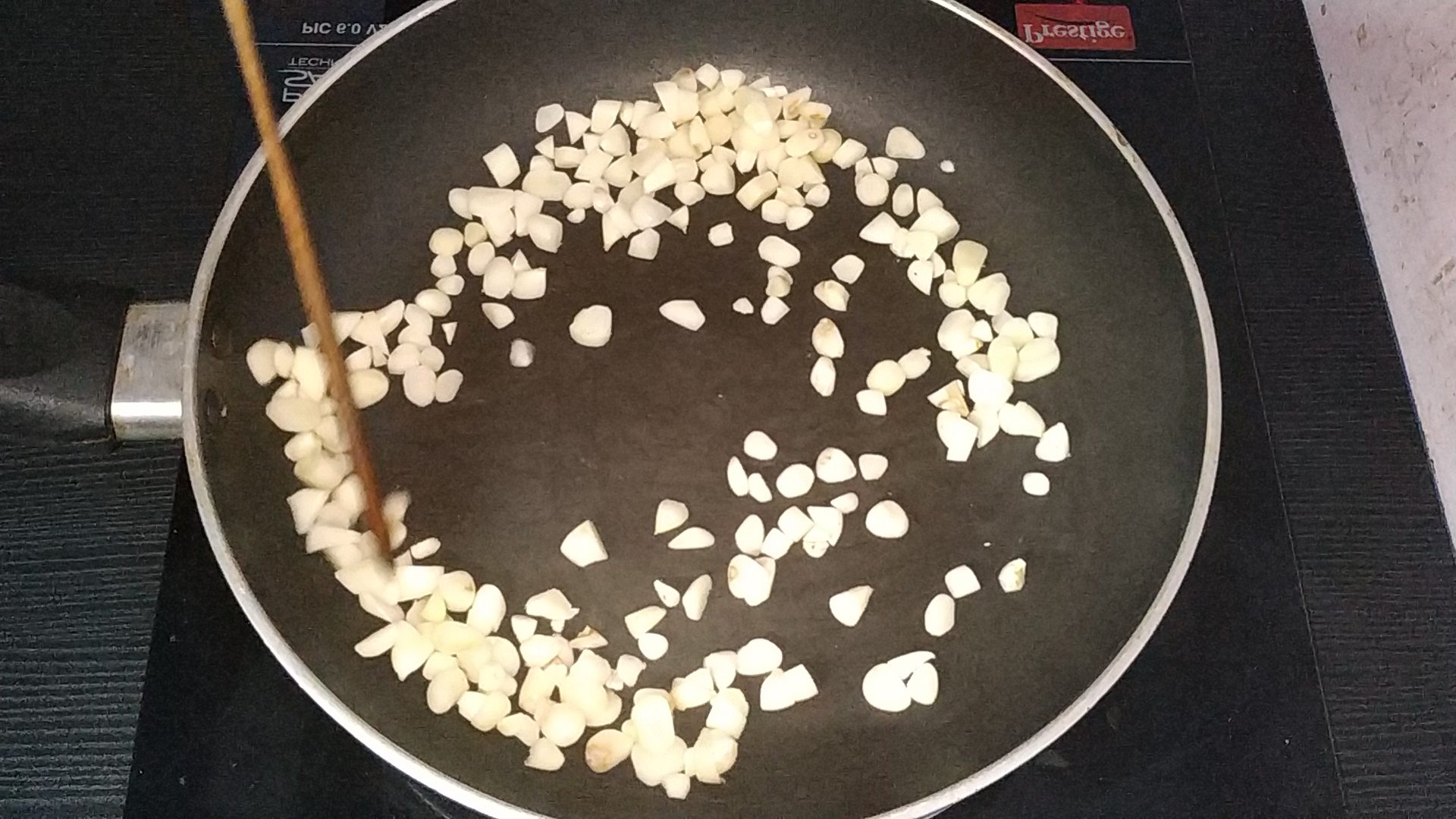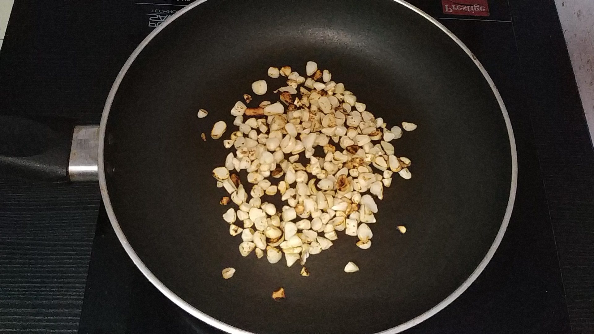 - Finally add the chopped garlic cloves and roast it until crisp and it is golden brown in colour.