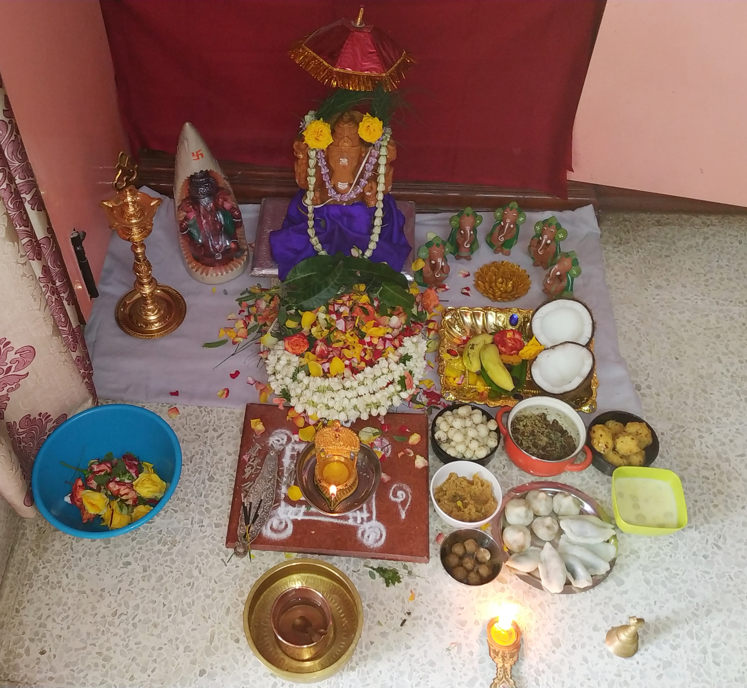 The next day, we perform the pooja with devotion, offering various Neivedhyam dishes such as Modak, Kozhukattai, and Payasam to Lord Ganesha. The priest or devotee concludes the pooja with a Deeparathanai, circling a lit lamp around the deity to symbolize the removal of darkness and the spread of light.