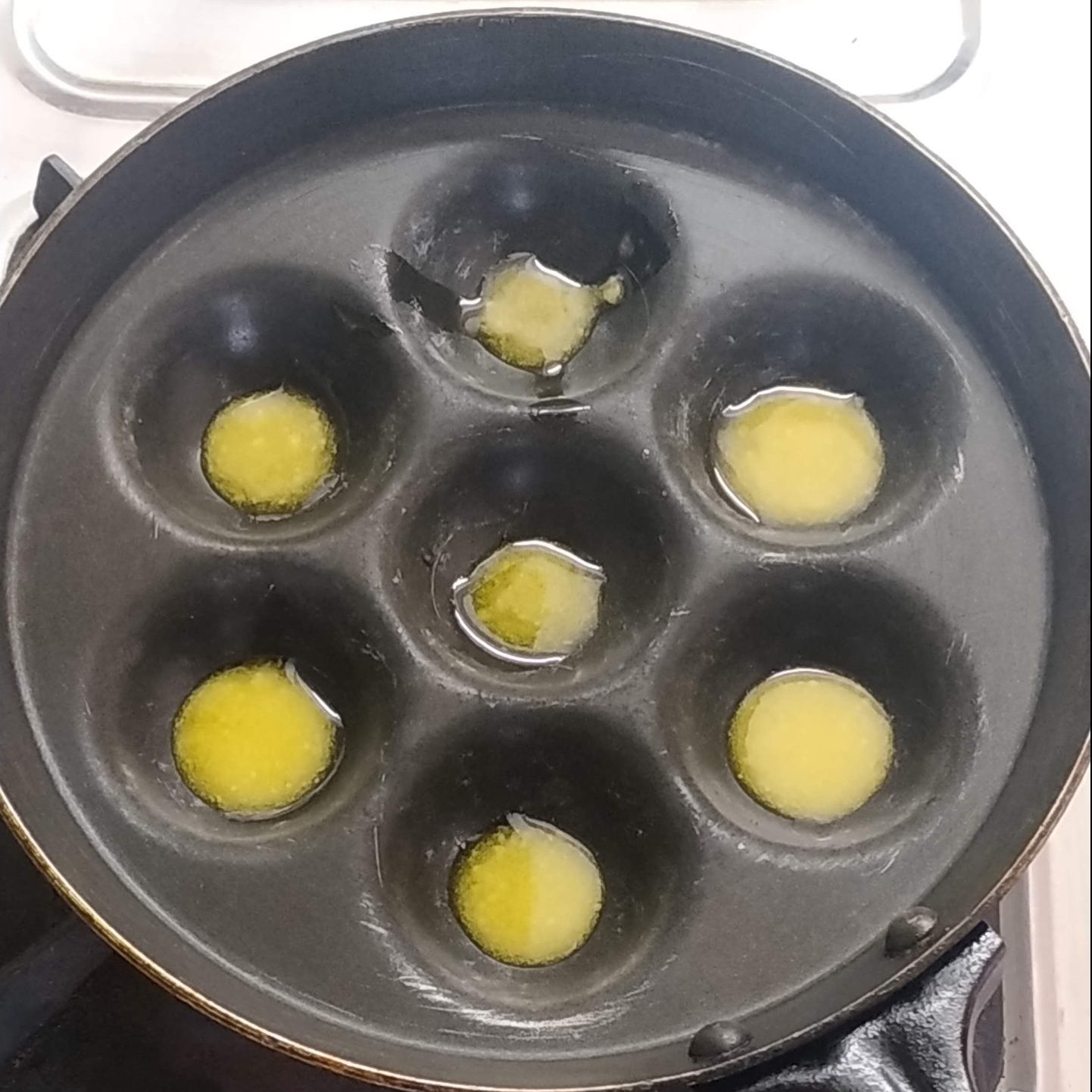 - Now heat the appe pan and add a tsp of ghee in all the holes.