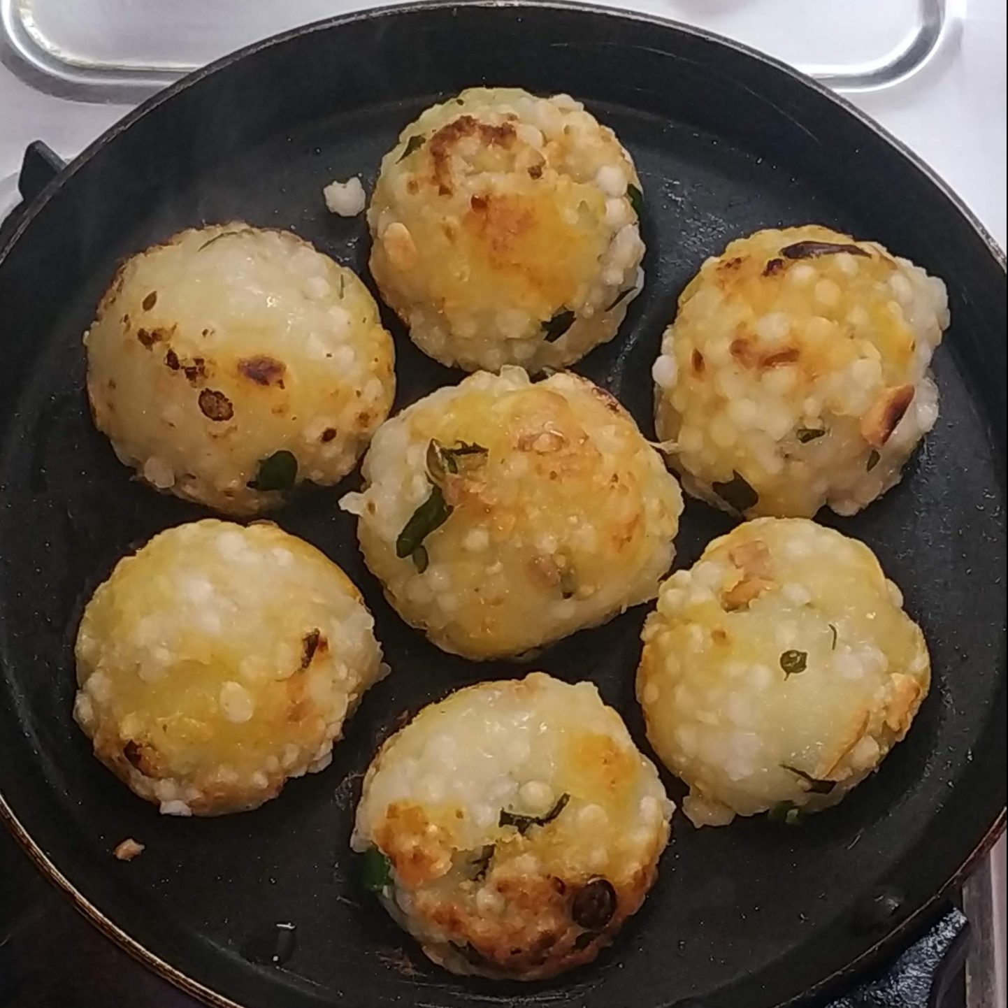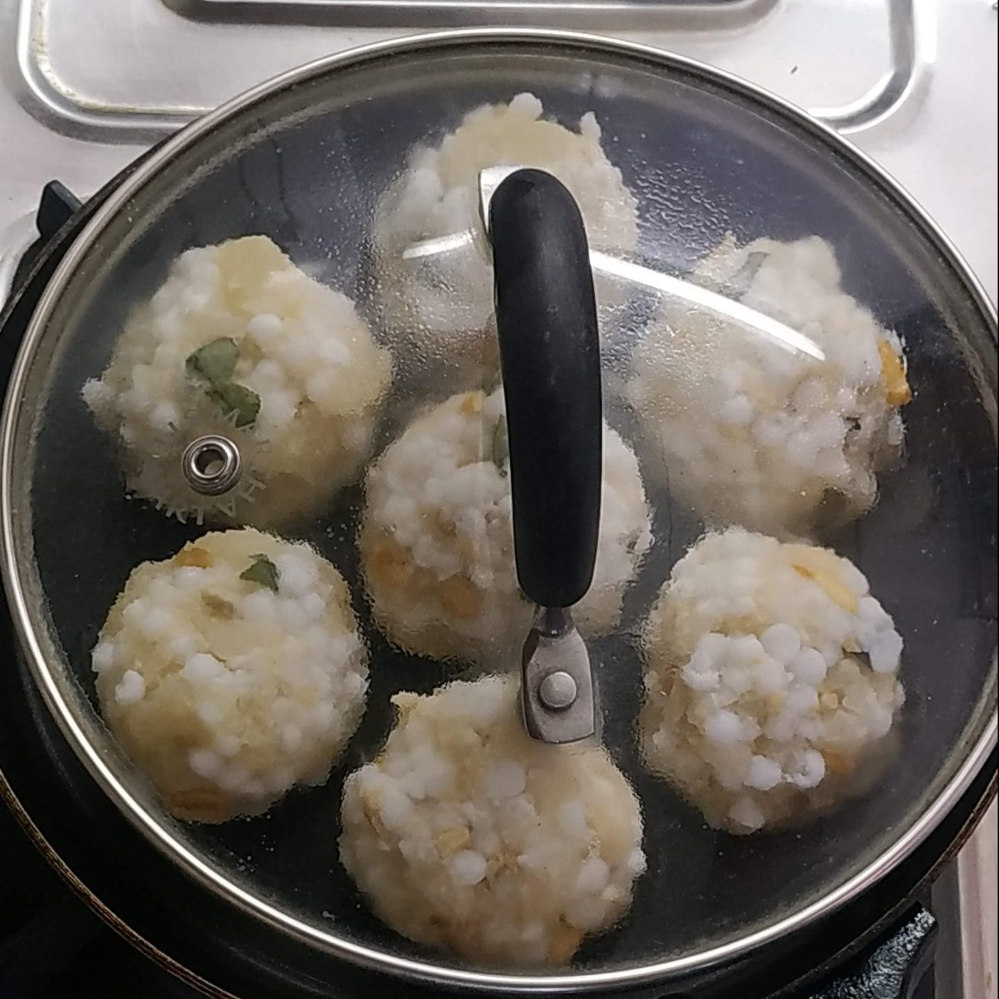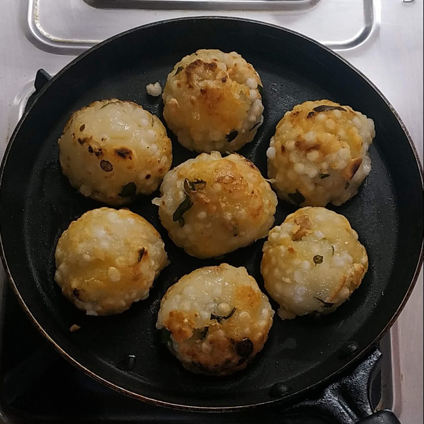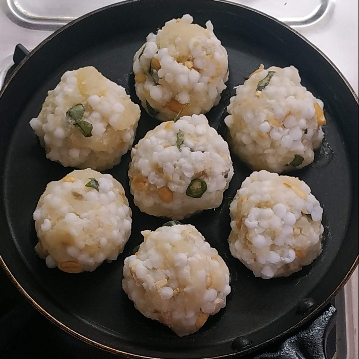 - Keep one sago ball in one hole and cook it in medium flame.