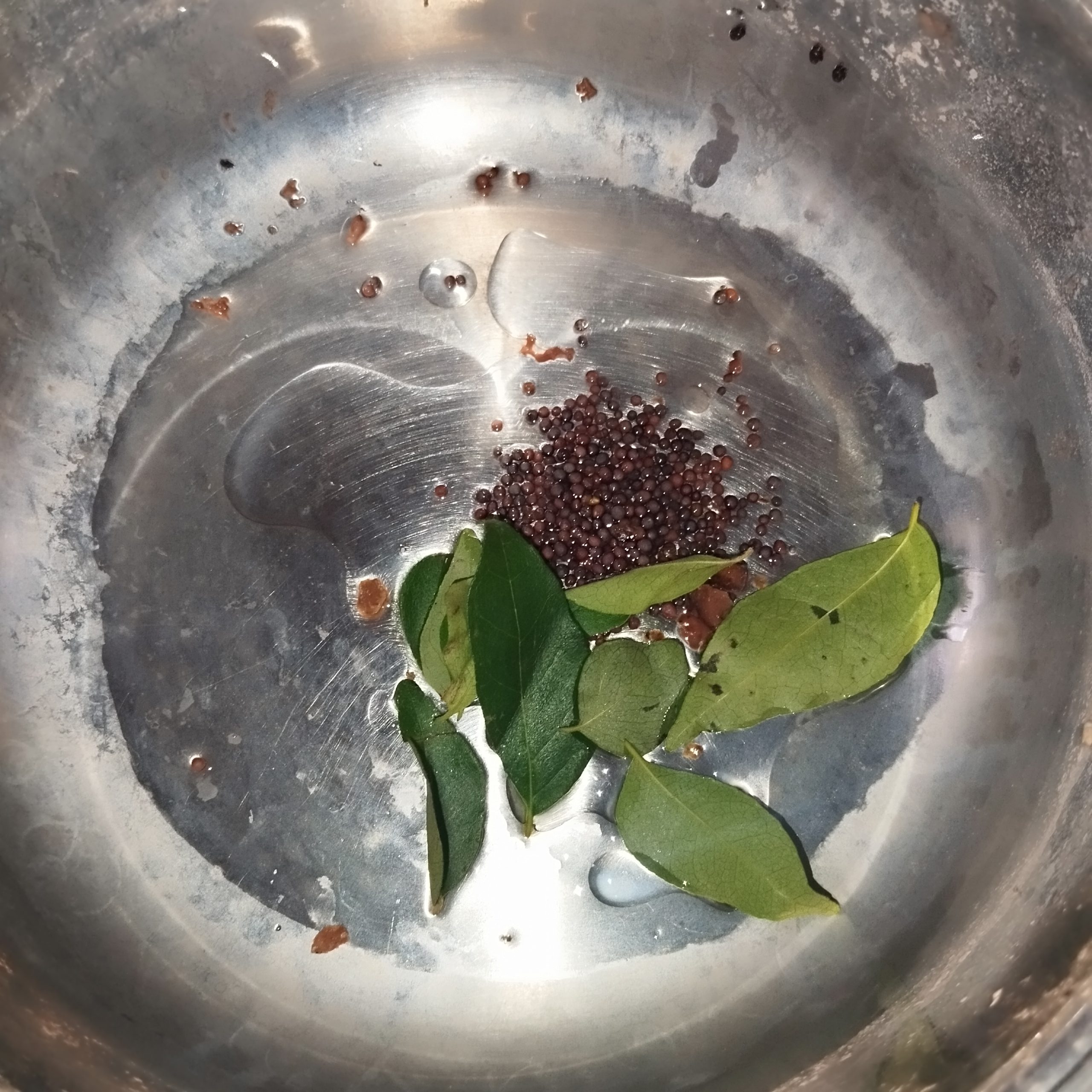 - Take a pan, add oil, splutter mustard seeds. Then add asafoetida and curry leaves. Saute them for a minute.