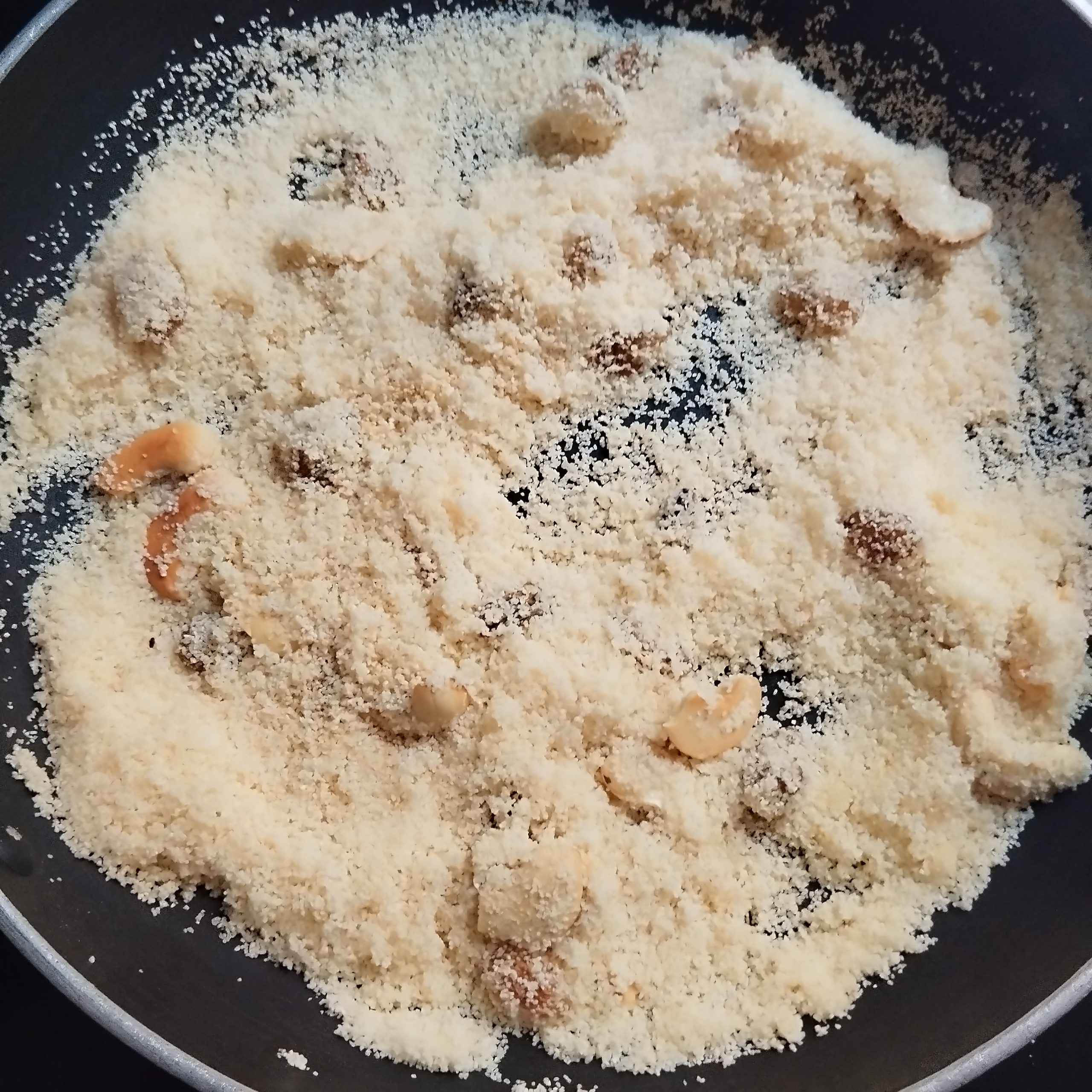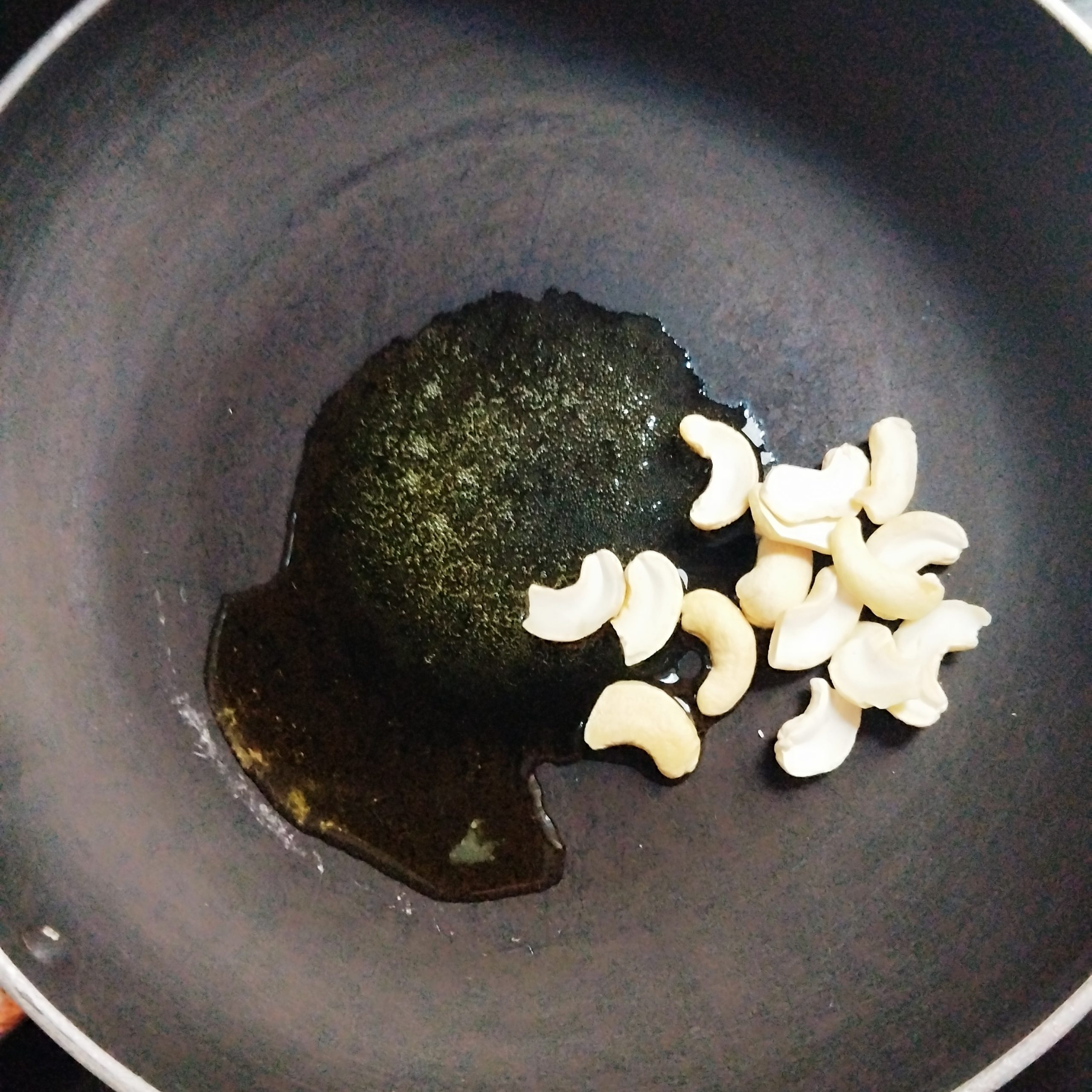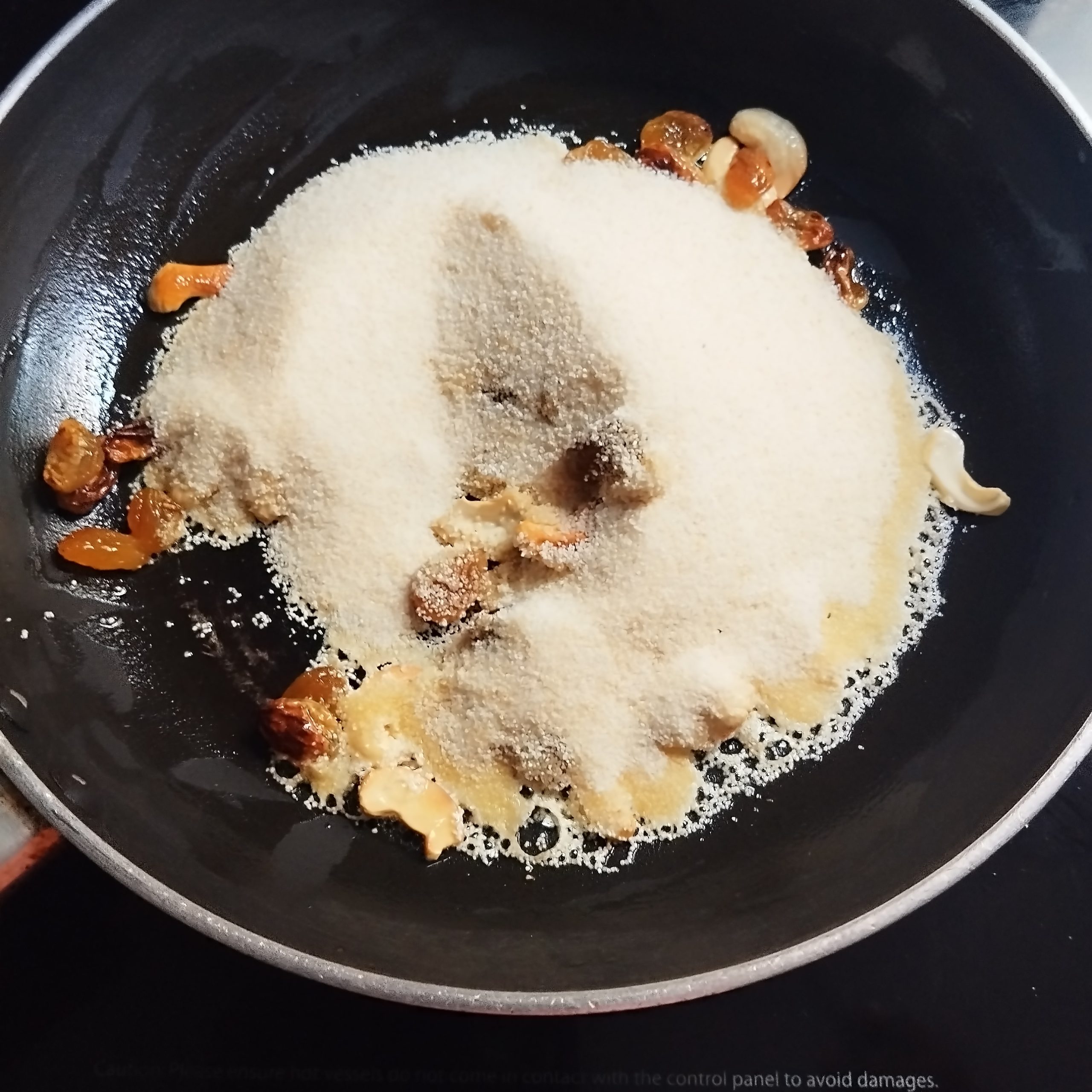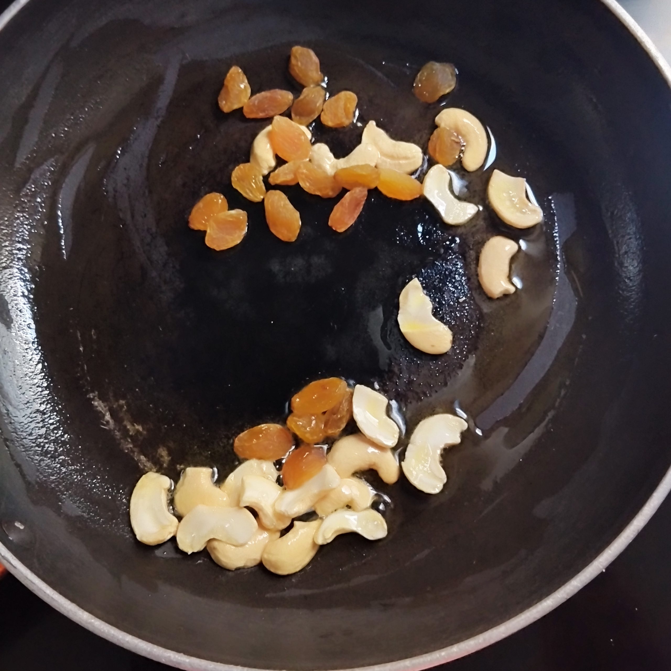 - In a frying pan add 2 tbsp ghee and fry the raisins and cashews until they are golden brown and keep them aside.