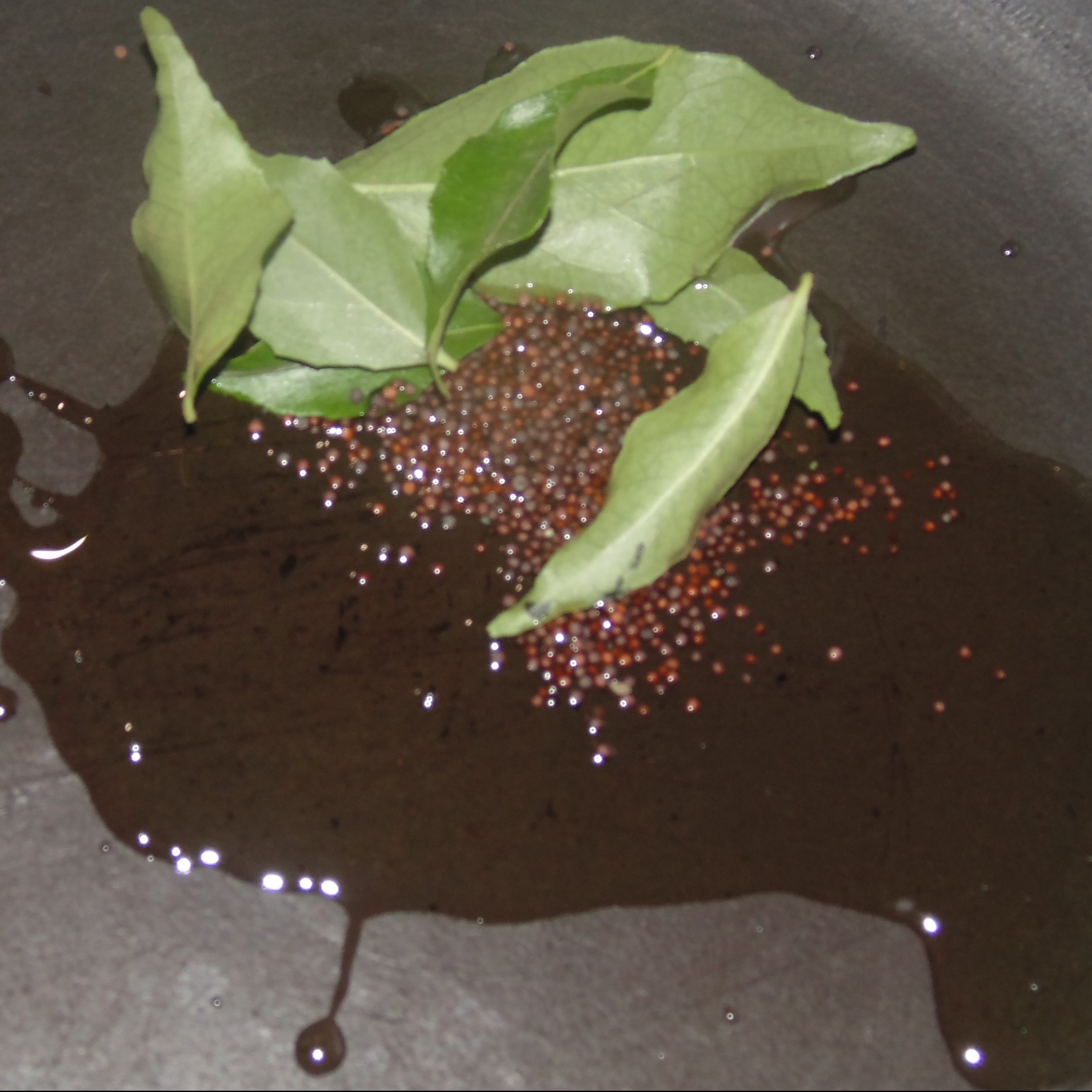 - In a pan, add coconut oil, splutter mustard seeds. Once they crack add curry leaves, jaggery, turmeric powder, salt and asafoetida.