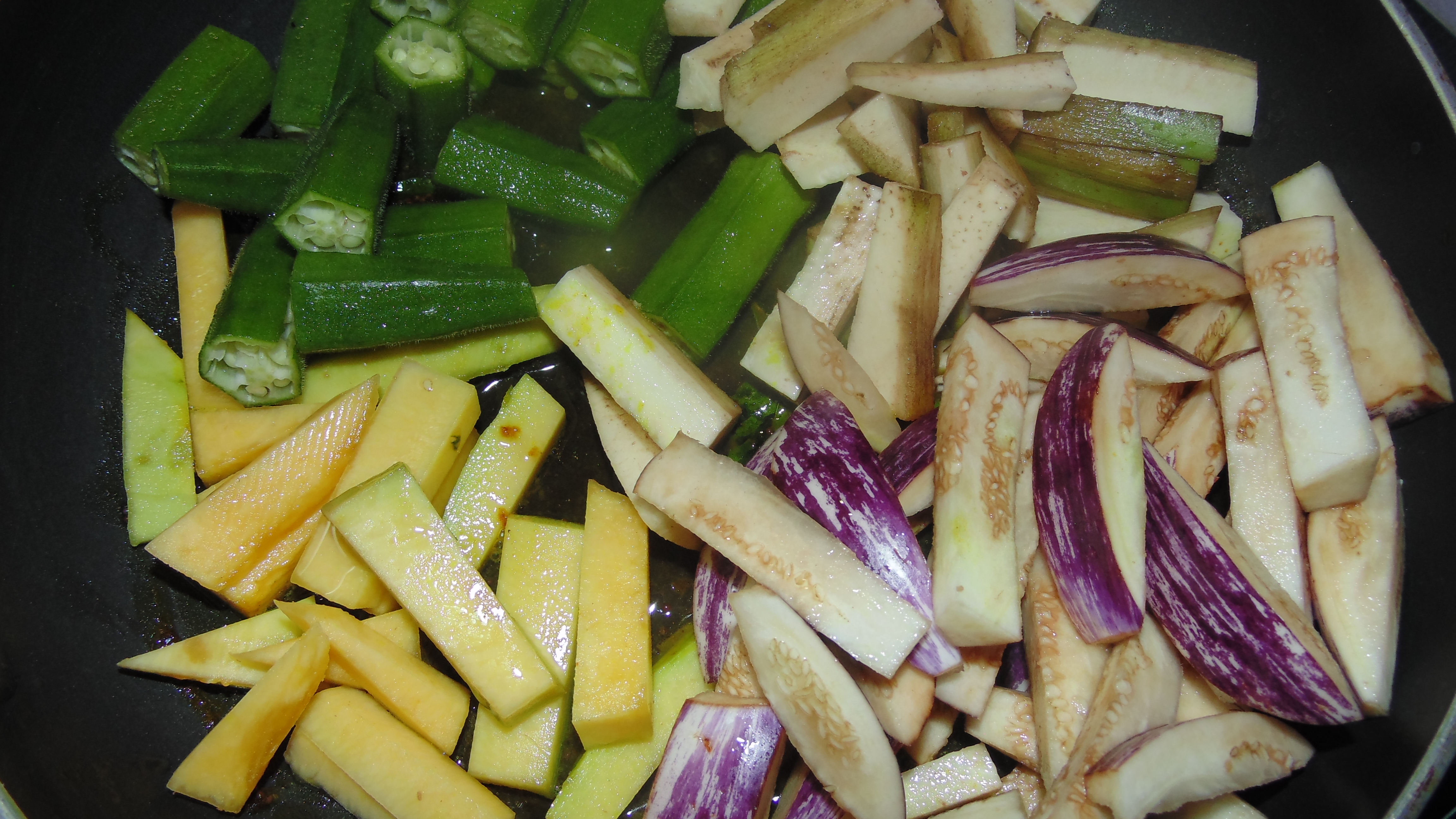 - Keep the plantain and brinjal in water to avoid discolouration.