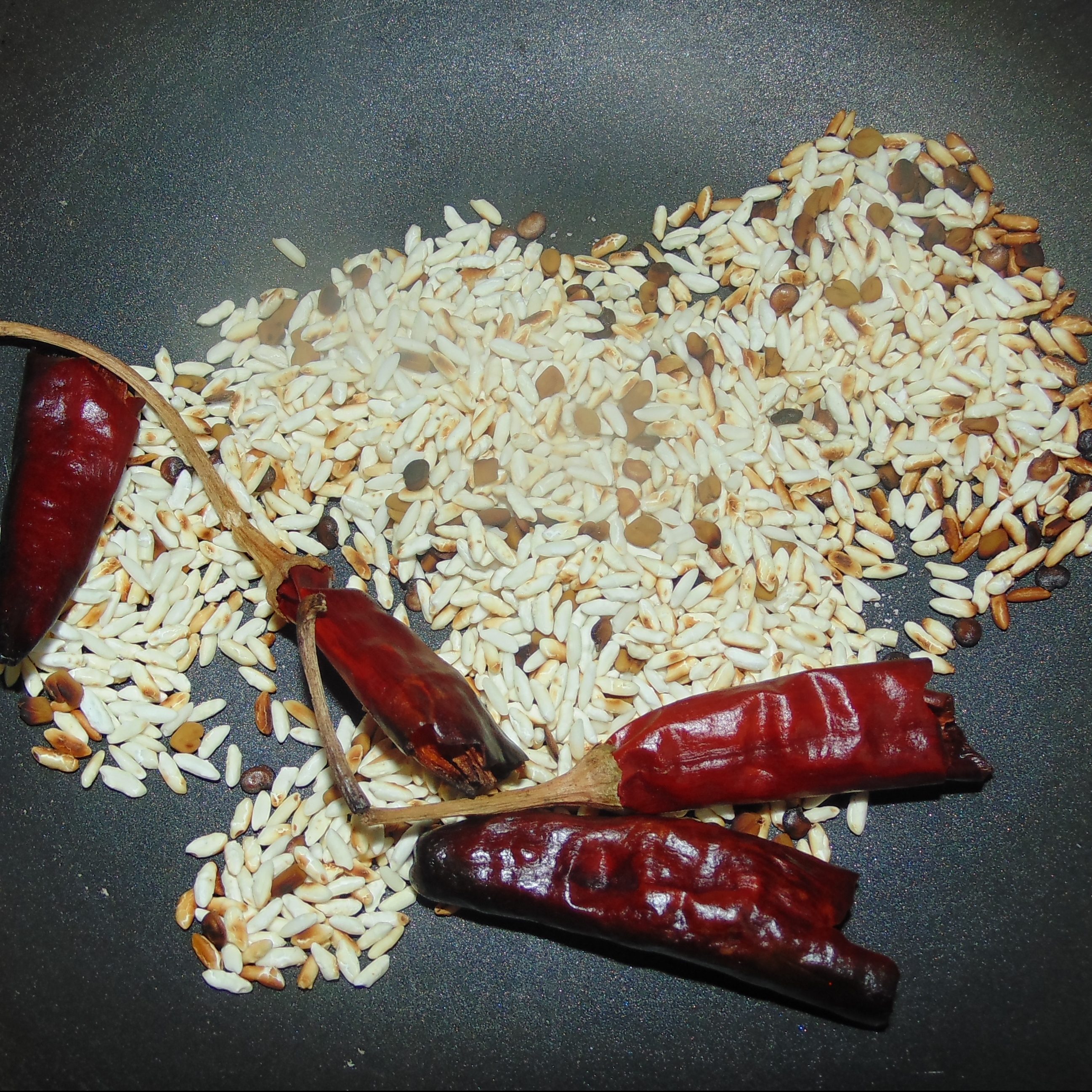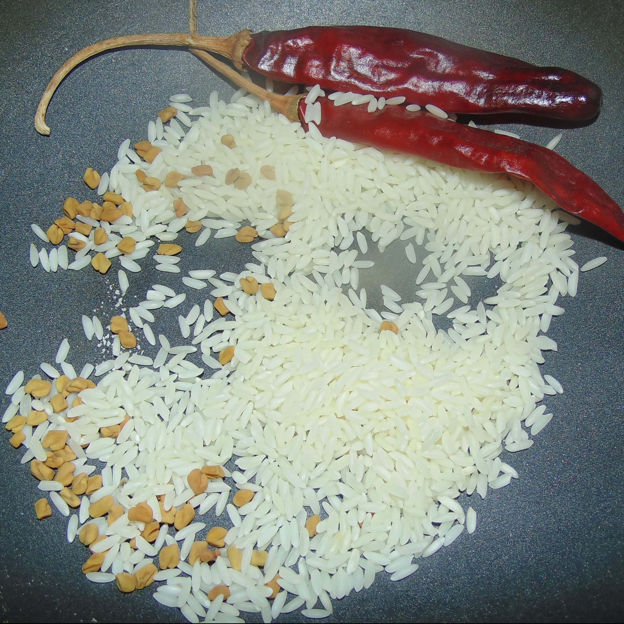 - In a pan dry roast raw rice, fenugreek, red chilli. Keep the flame low and roast else the rice will turn black. Roast until they are light brown.