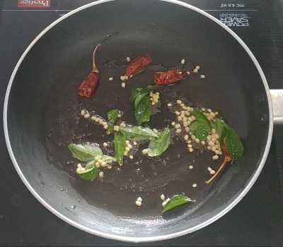 - In a kadai, add enough coconut oil, splutter mustard seeds. And then add urad dal, saute until it turns golden brown.