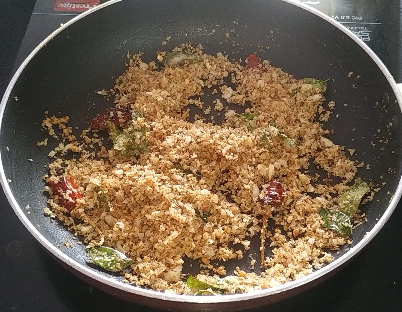 - Then add curry leaves, shredded coconut and roast the coconut until it turns golden brown.