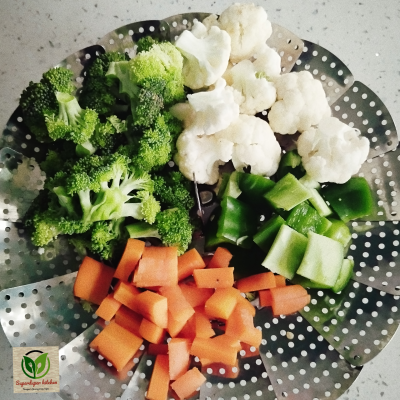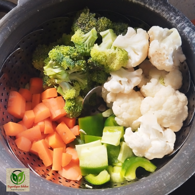 - Steam cook the vegetables. The vegetables should not be over cooked. If you press it with your fingers, it should mash.