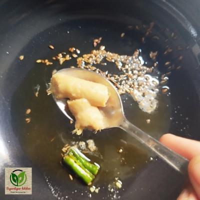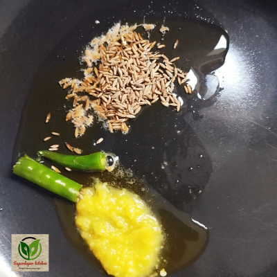 - Heat oil or ghee in a large pan. Add cumin seeds and let them saute and then add green chilli. Green chilli will give a nice flavour and spiciness to the recipe.