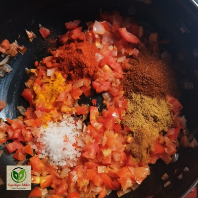 - Stir in the ground spices (turmeric, coriander, red chili powder, garam masala, cumin seeds powder) and a required amount of salt into the pan.