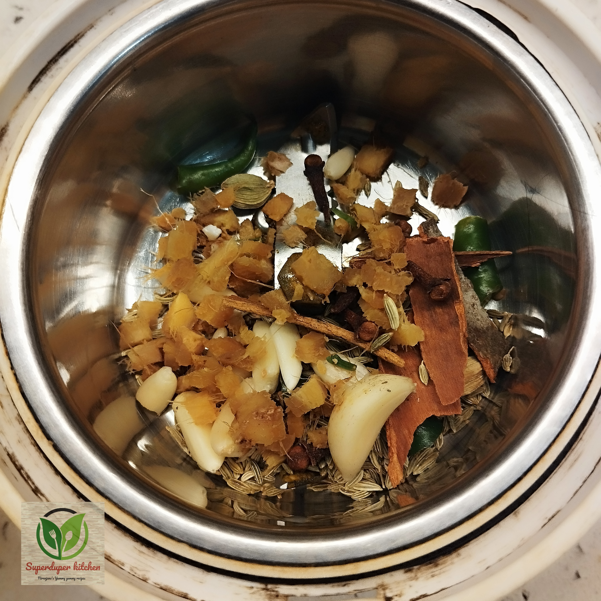 - In a mixie jar, combine ginger, garlic, green chilli, fennel seeds, cardamom, cinnamon, and clove.