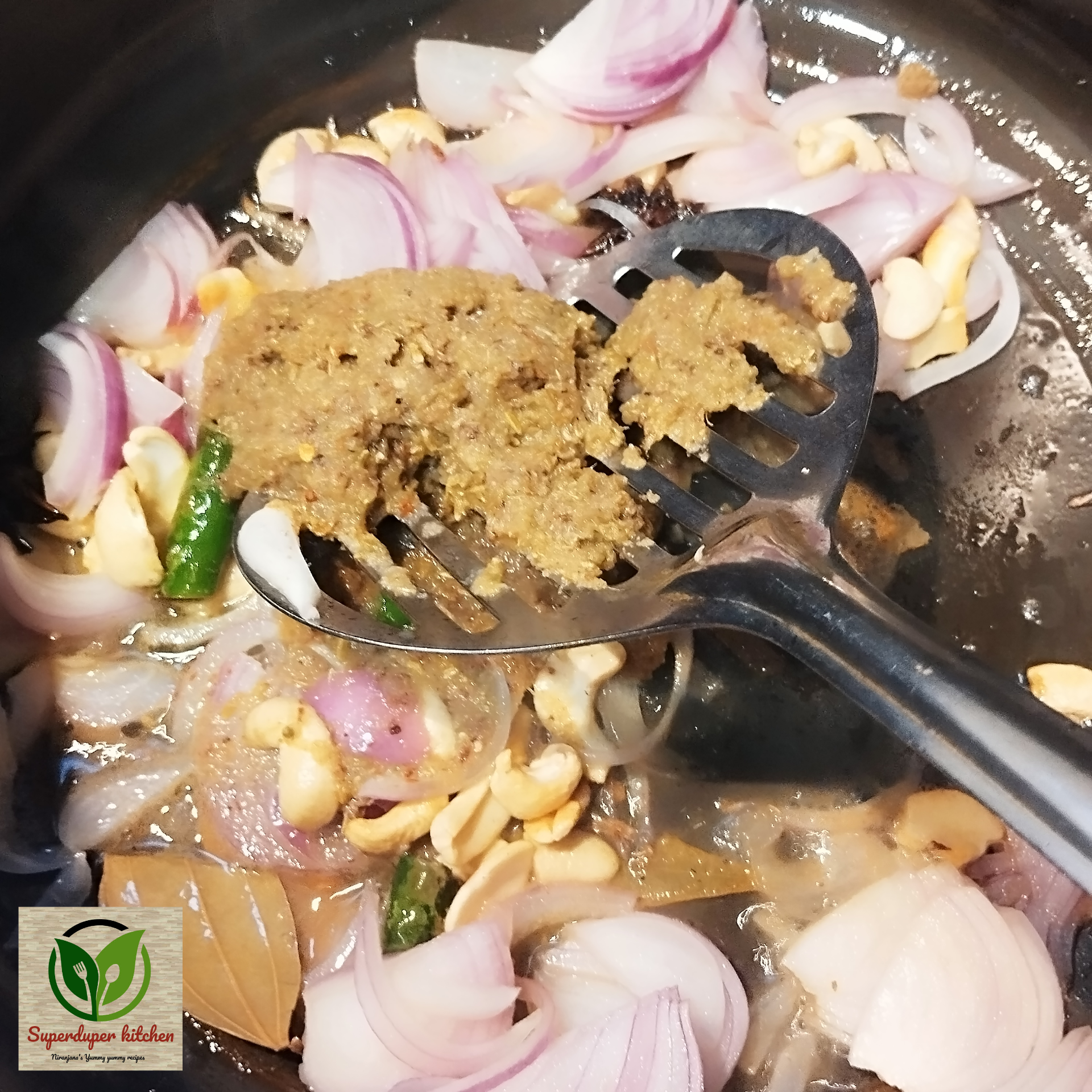 - Then, add the ground masala paste and sauté until the raw smell disappears.