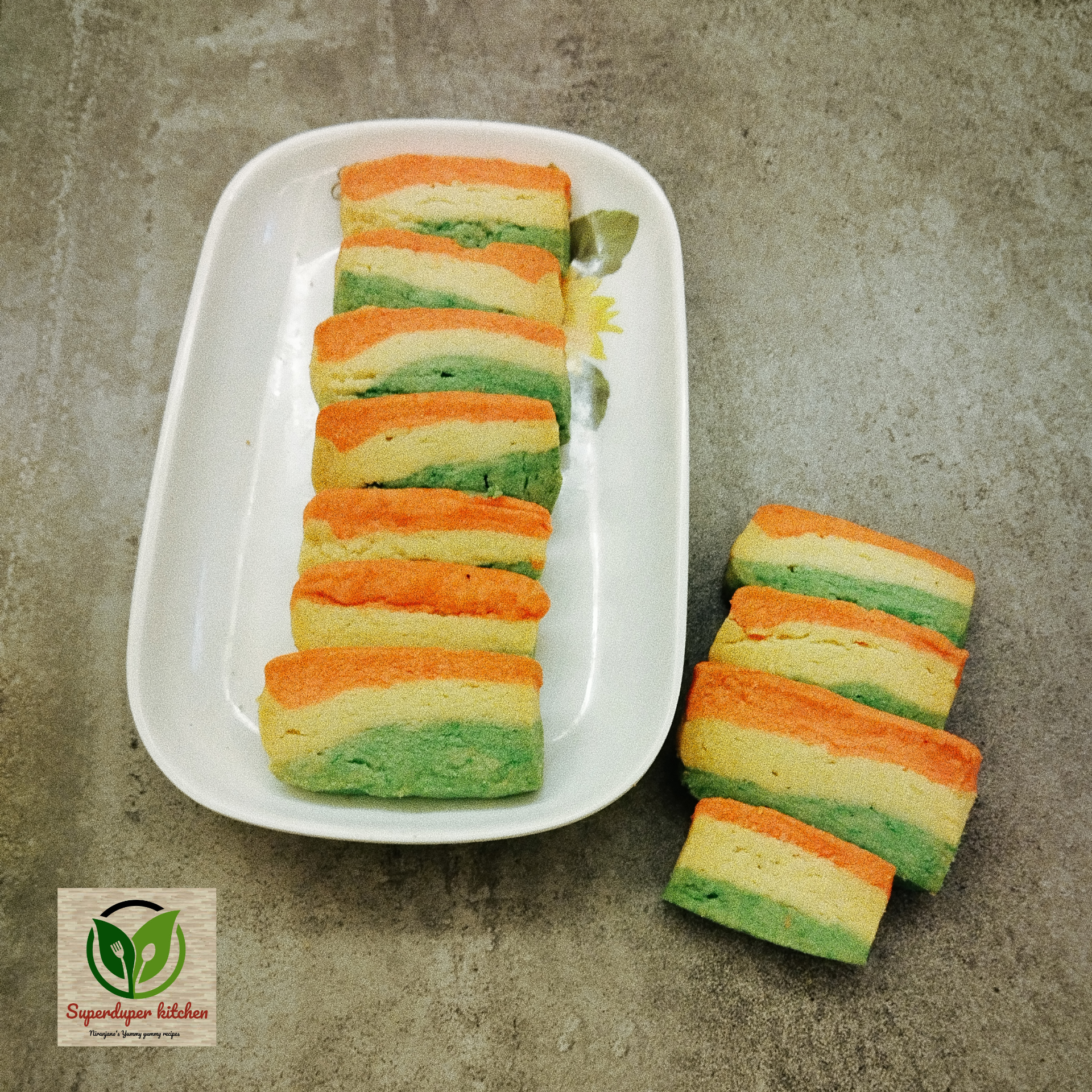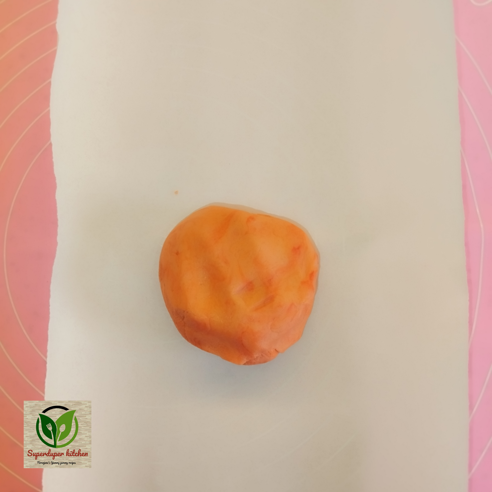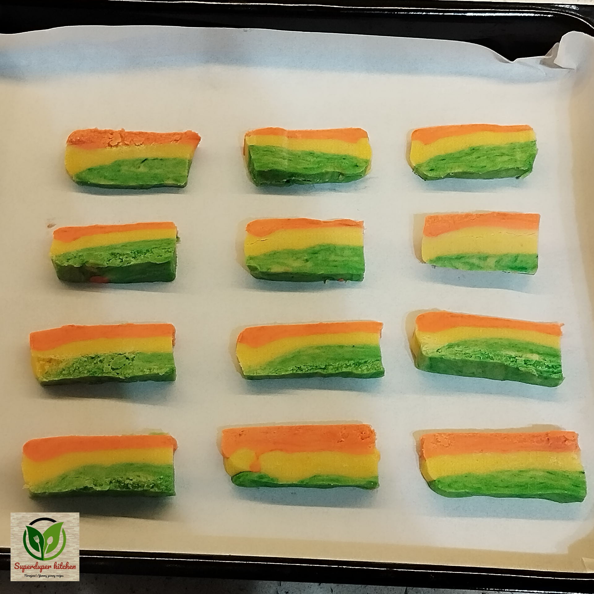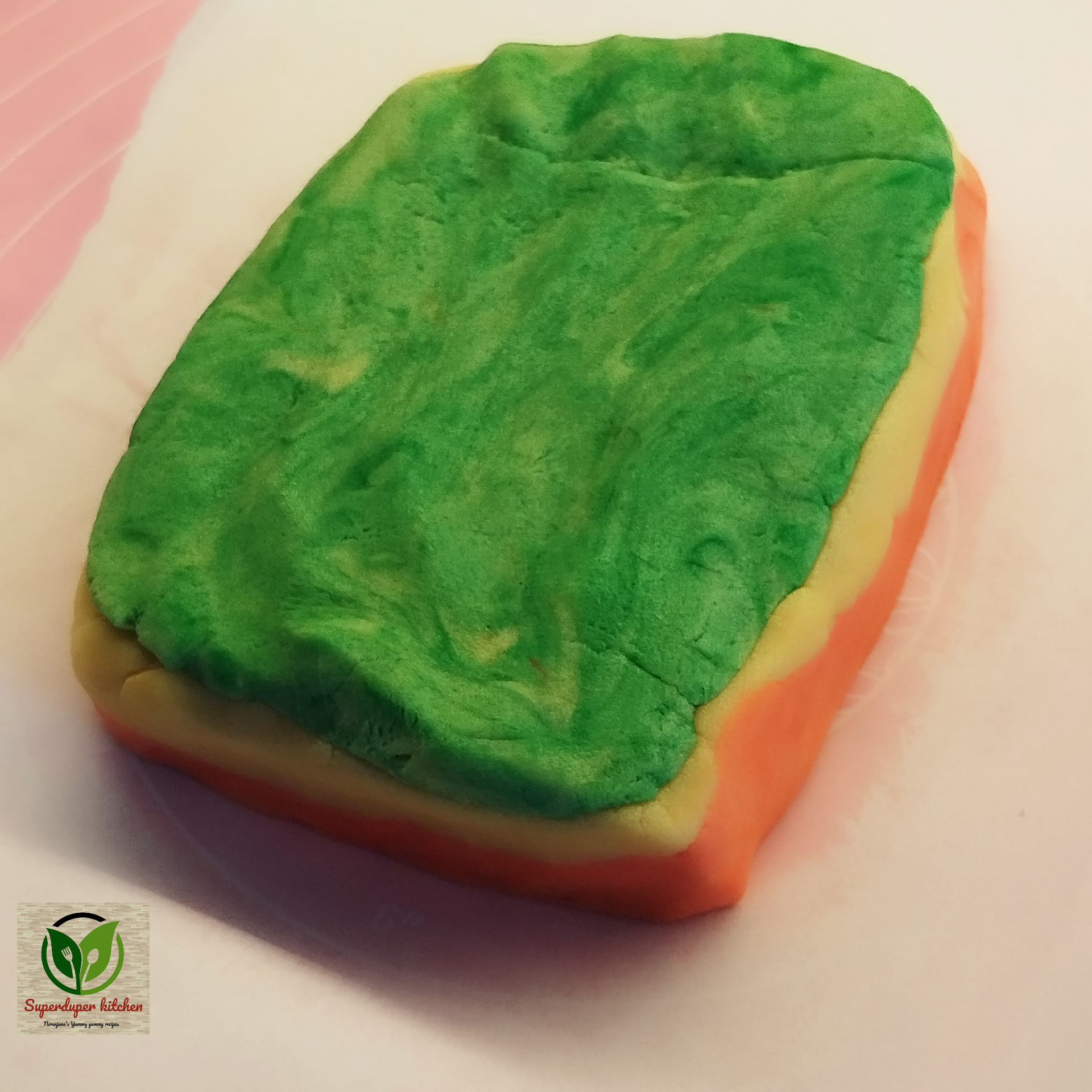 - Stacking: On a sheet of butter paper, first lay down the orange dough, then place the plain dough on top, and finally layer the green dough on top of that.