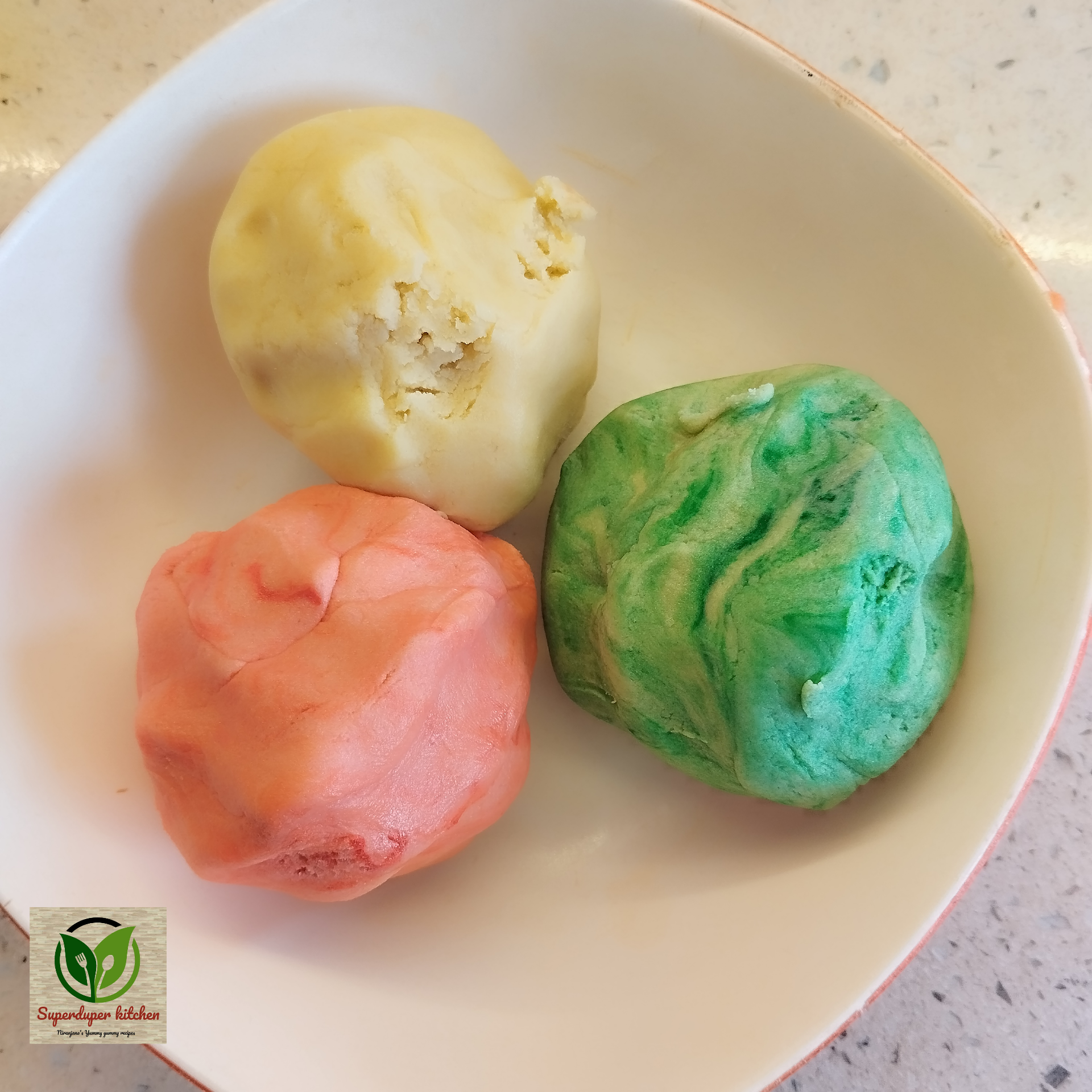 - Dividing the Dough: Separate the dough into three portions. Add green food colouring to one portion and orange food colouring to another, leaving the third portion plain.