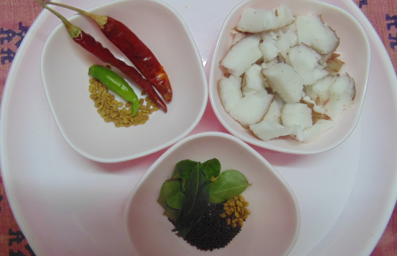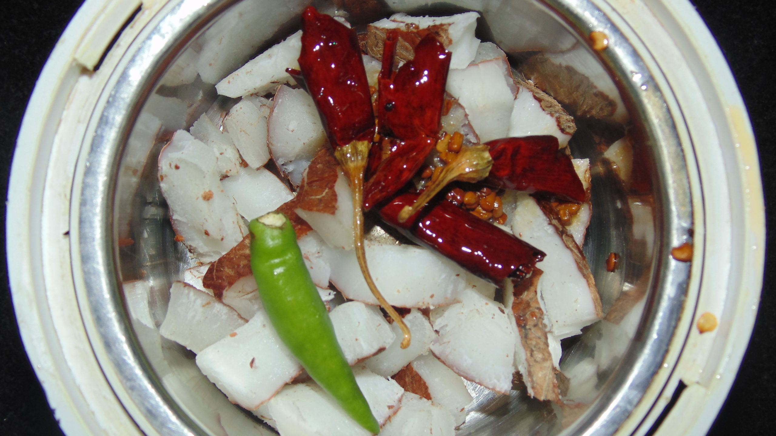 - In a blender, add Coconut, Green chillies, Red chillies and Fenugreek seeds. Add a little water and grind the mixture into a smooth paste.