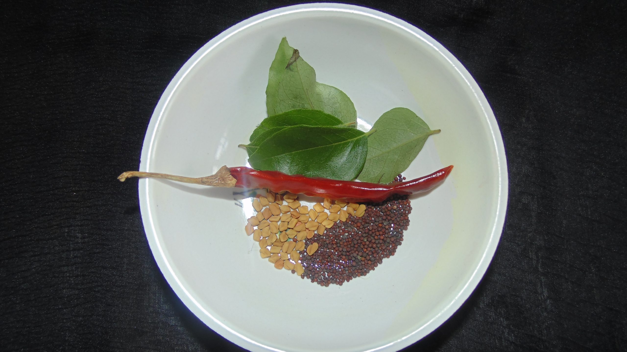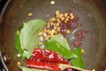 - Add dry red chilies, fenugreek seeds, and curry leaves. Sauté for a few seconds until fragrant.