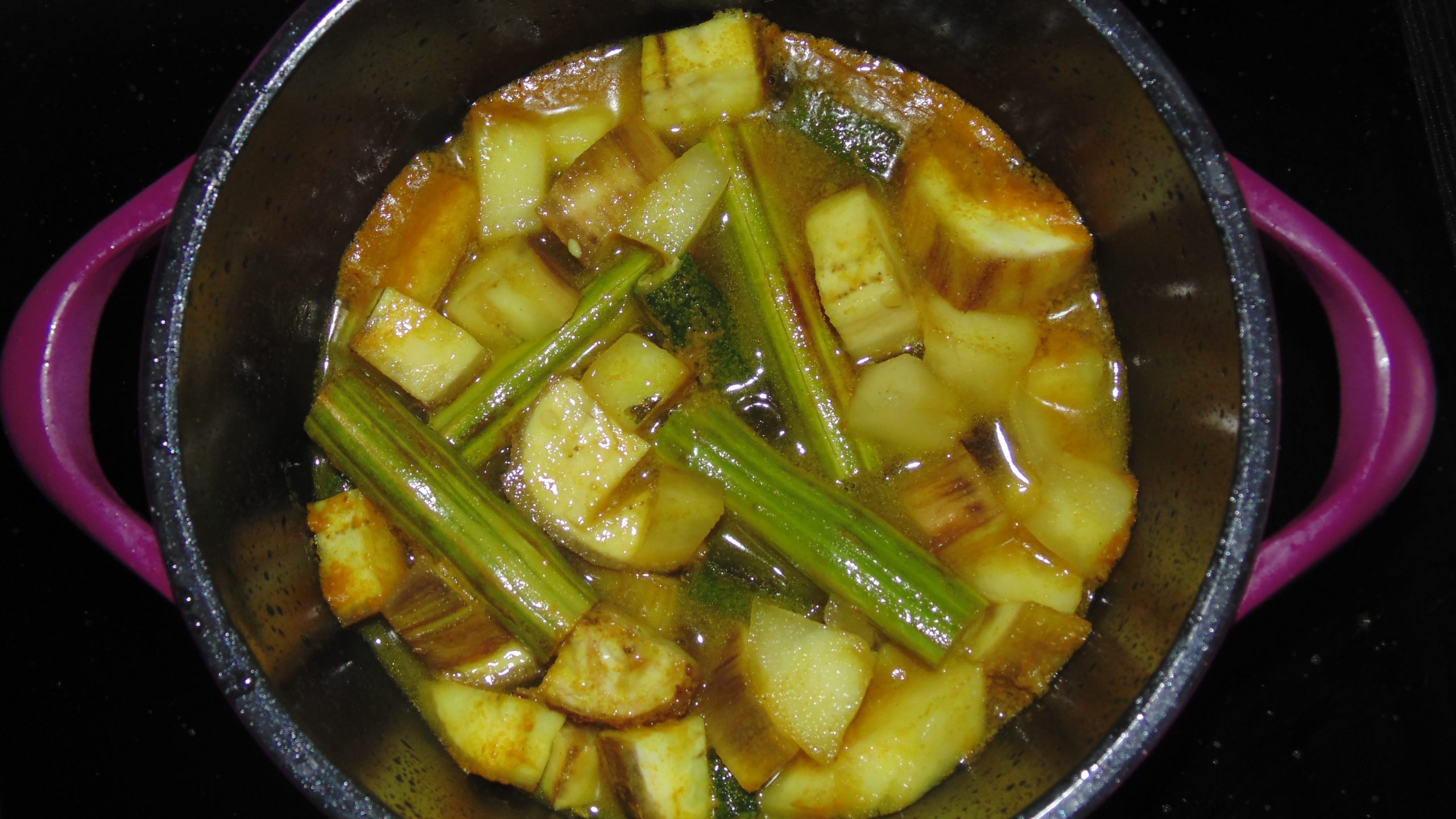 - In a large pan, add the diced vegetables, turmeric powder, and a pinch of salt. Add tamarind water to cover the vegetables and cook them on medium heat until they are soft but not mushy. Add jaggery at this stage. Set aside.