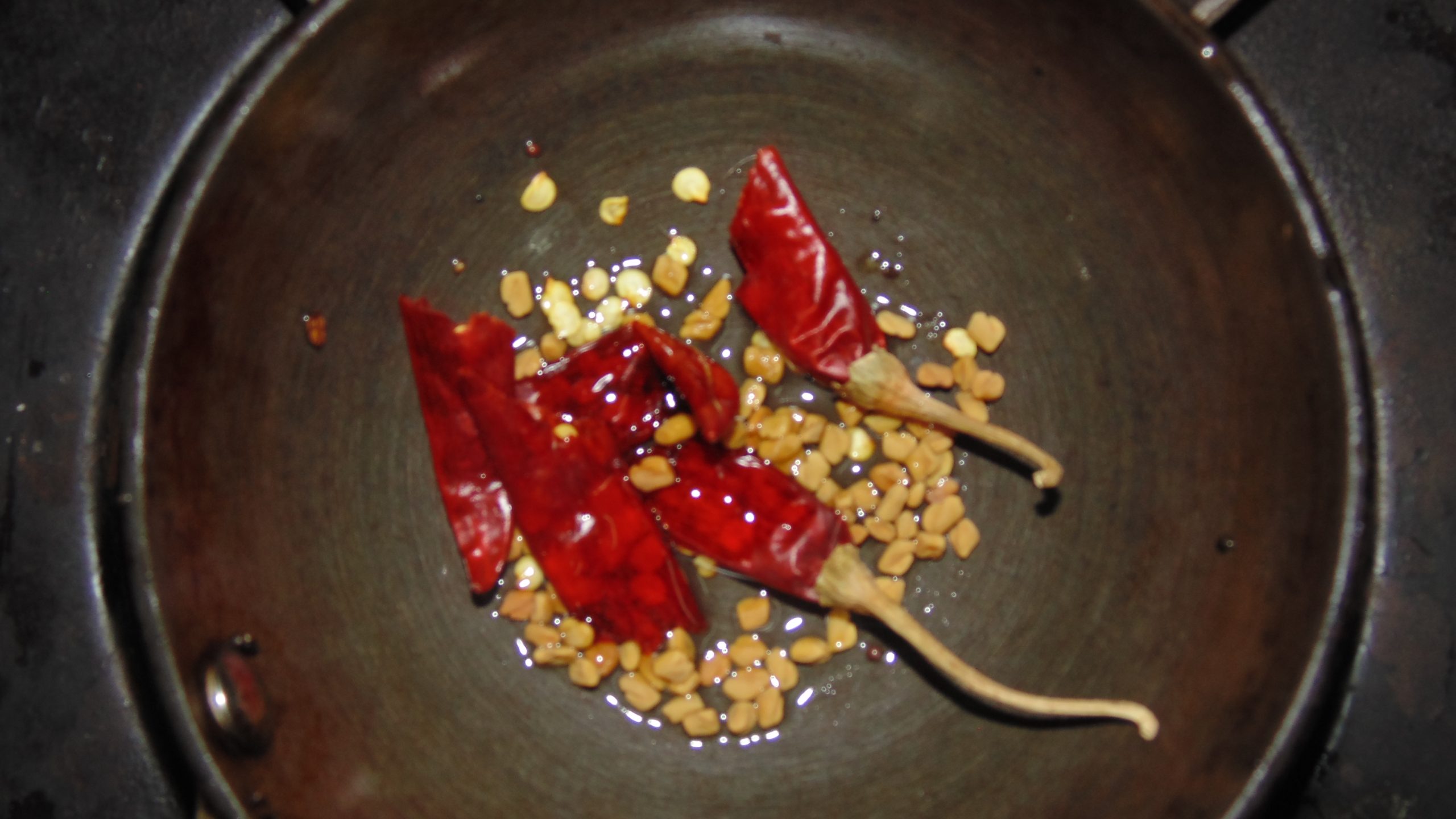 - Dry roast the Fenugreek seeds and red chilli. You can also add little bit of raw rice but I have not added.