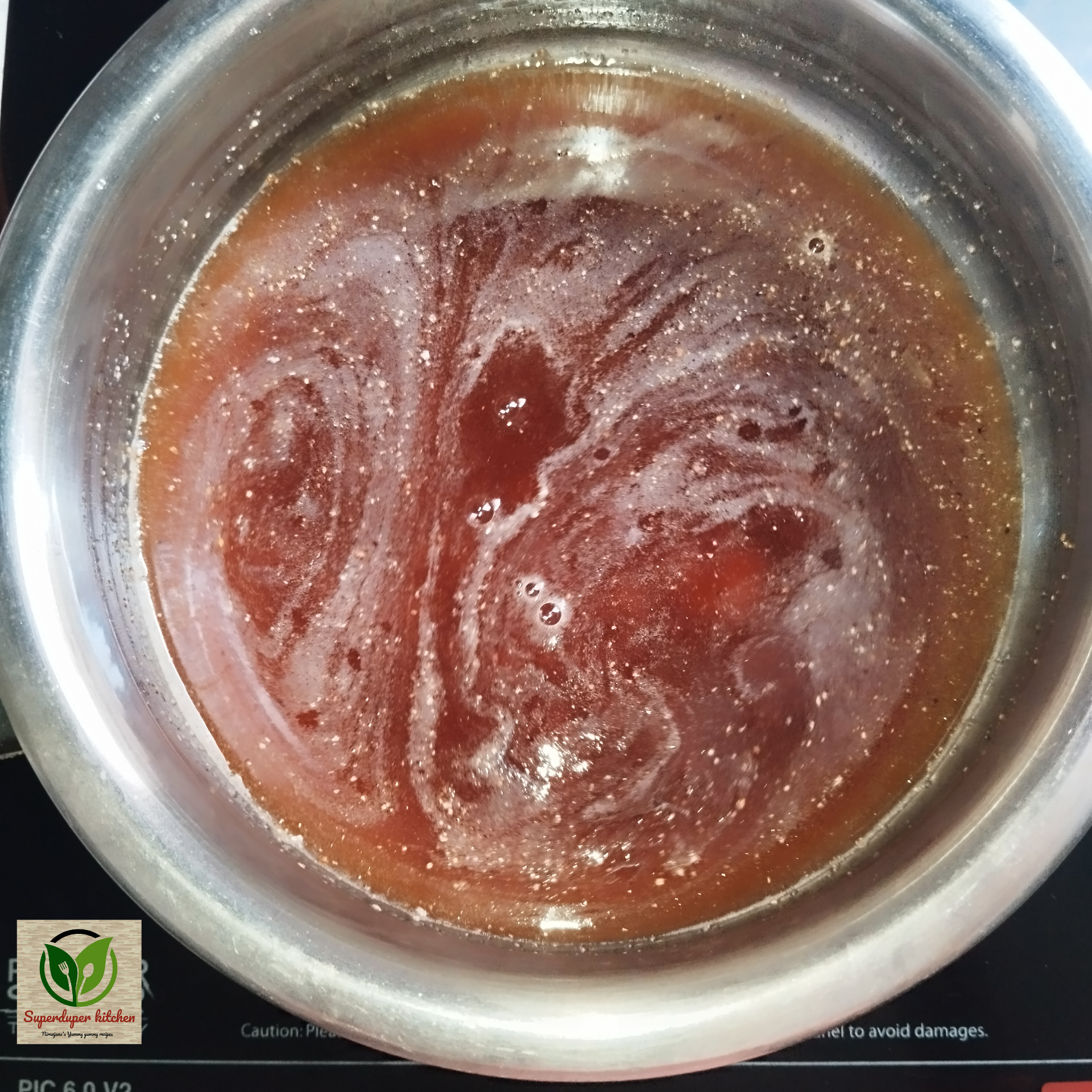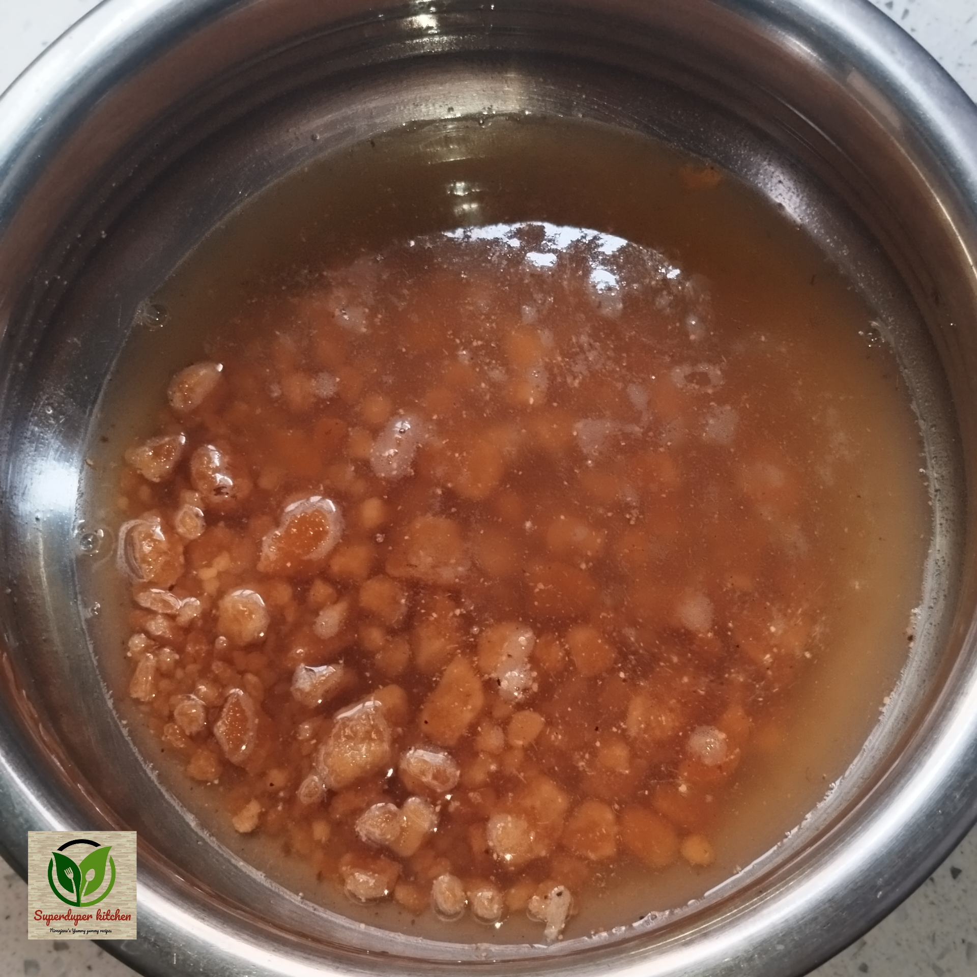 - To check the consistency add a tsp of jaggery syrup in a small bowl of water. Try to make ball with the jaggery syrup. It should not dissolve. That is the right consistency.