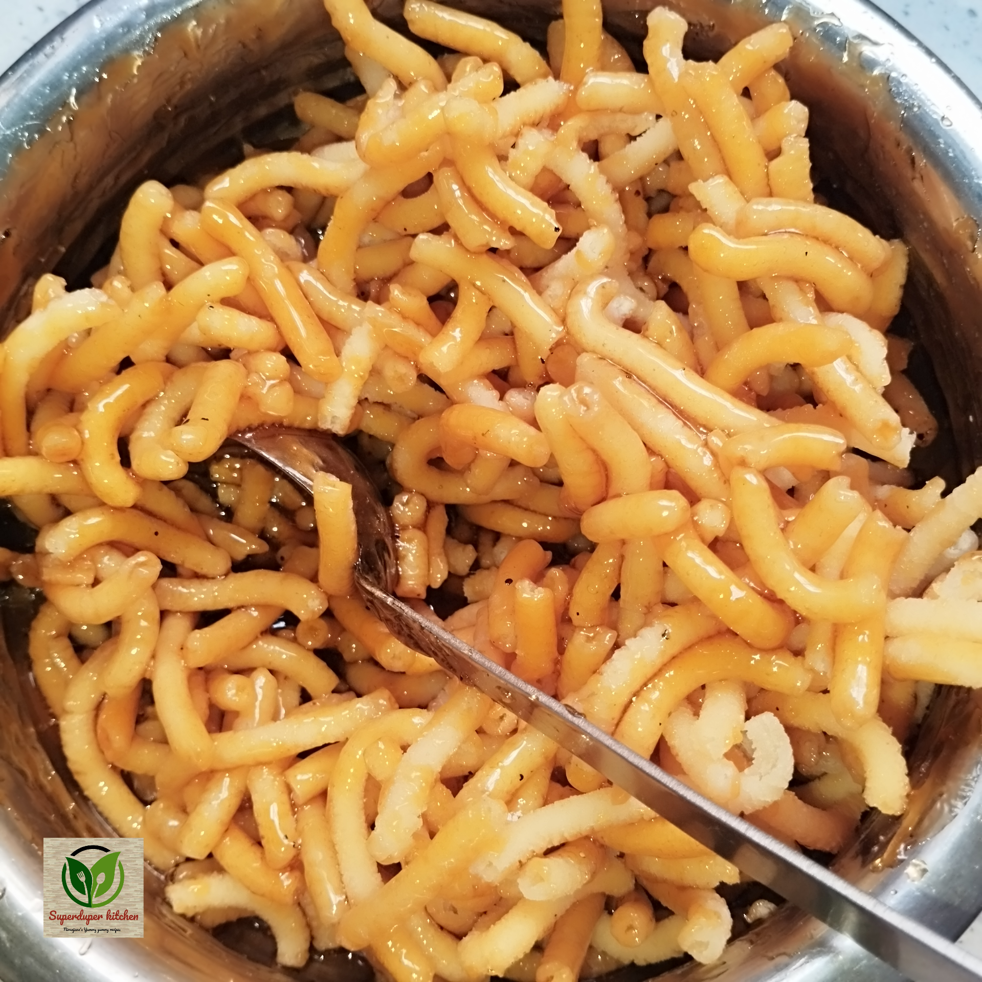 - Mix it well with a Spatula and coat the murukku pieces with jaggery syrup.