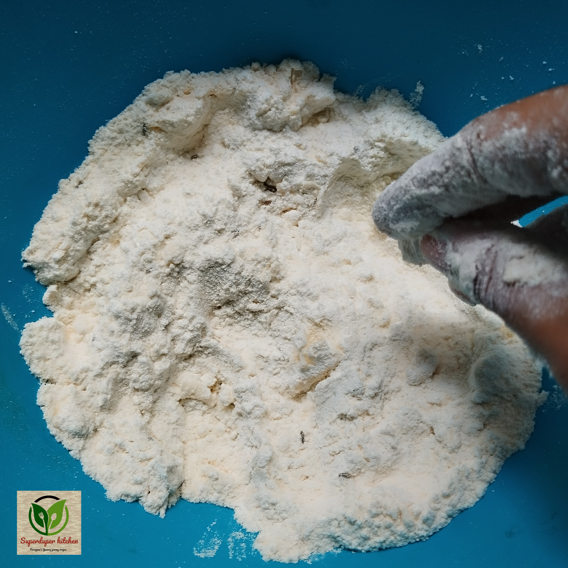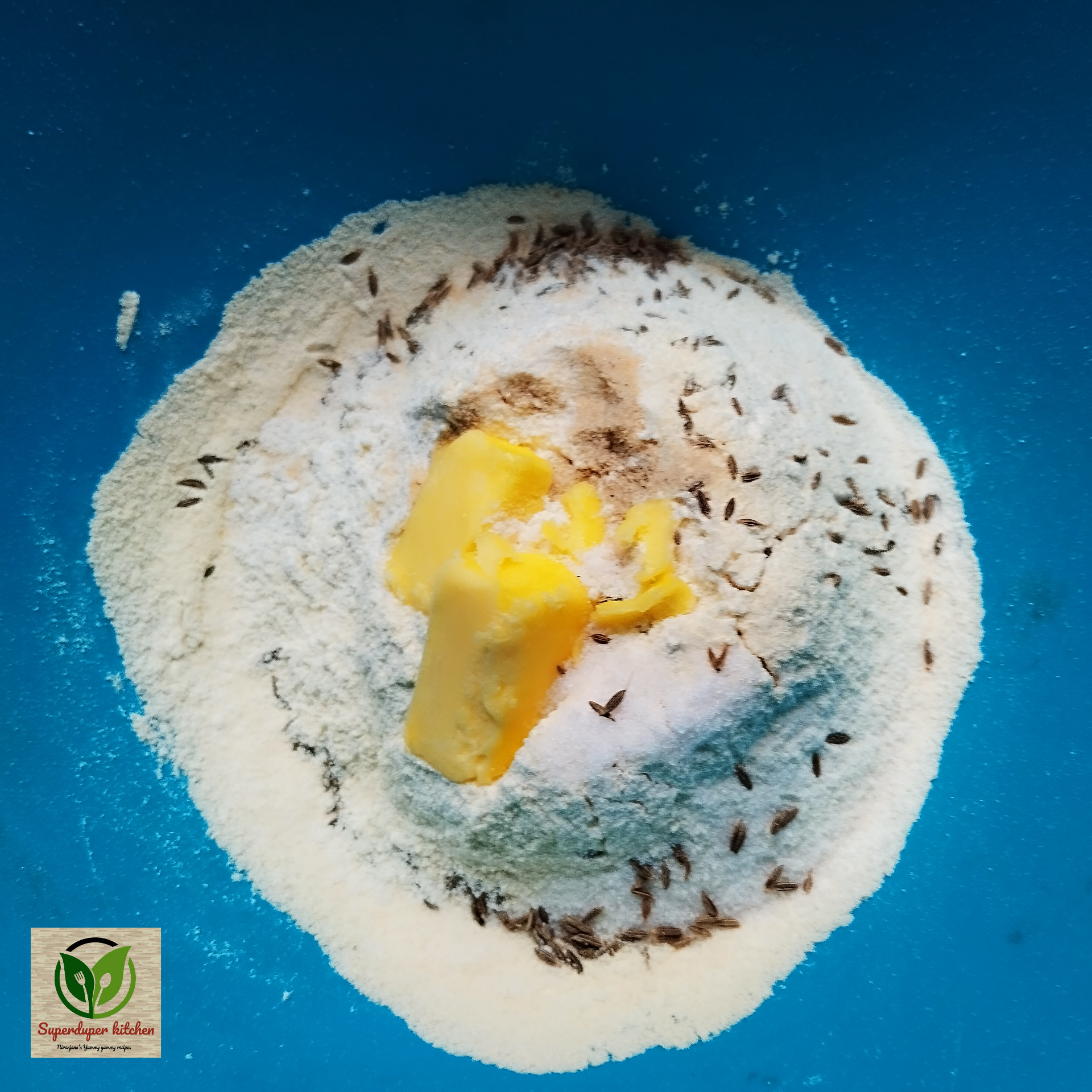 - Into it add asafoetida, cumin, butter, salt and mix it well with the flour.