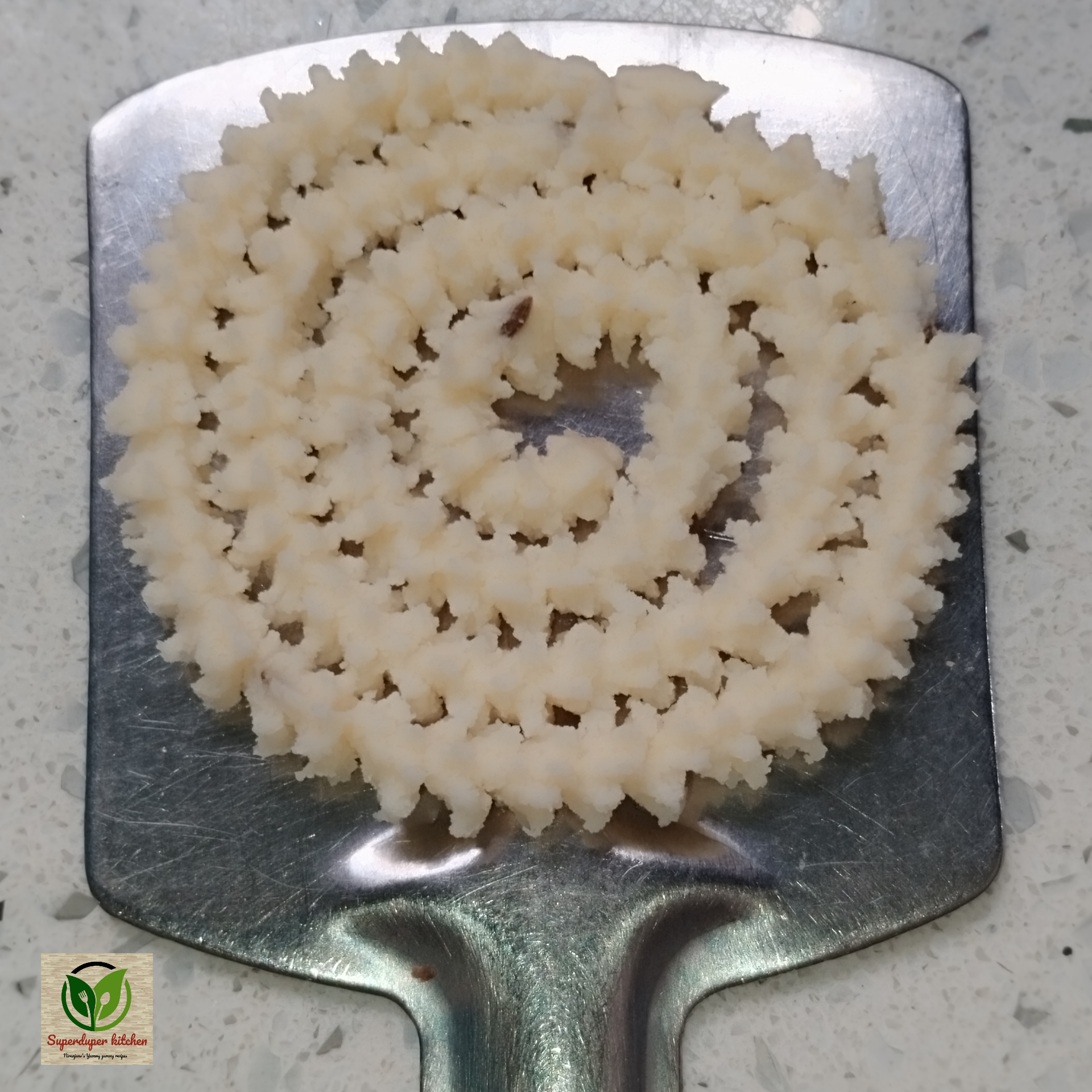 - Now slowly press the Murukku maker and start making Murukku on a Flat ladle in concentric circles.
