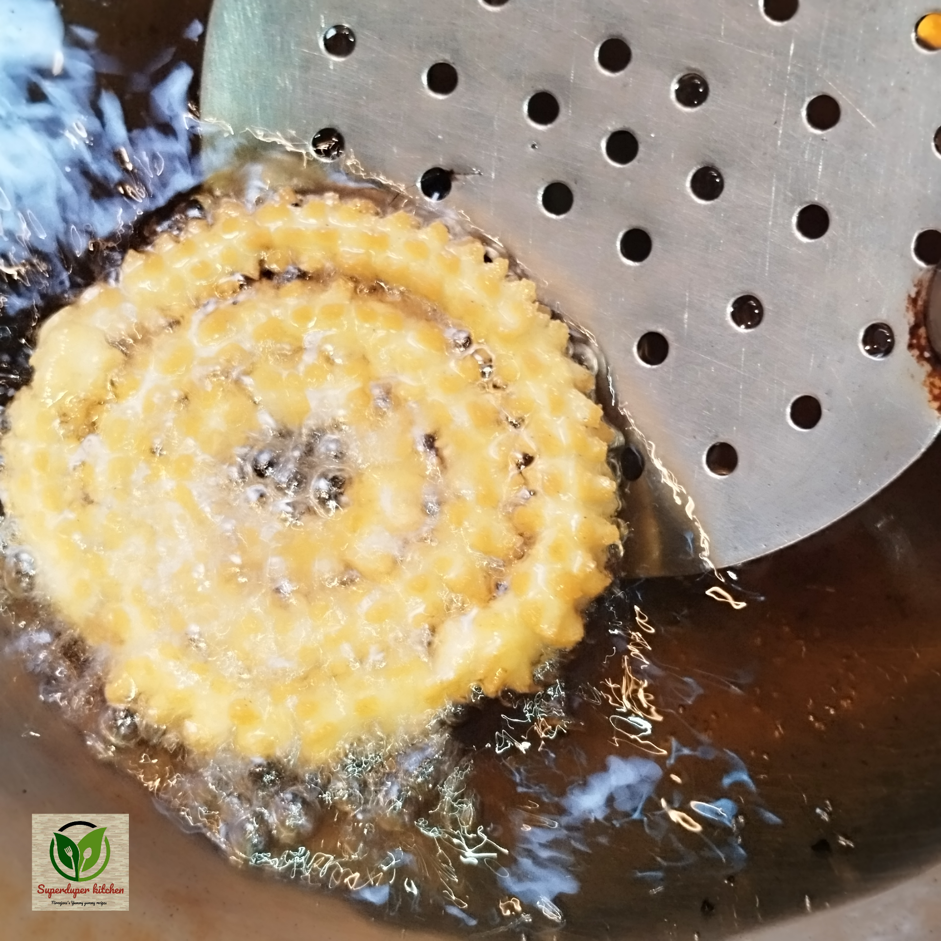 - Fry the Murukku until the sizzling sound subsides. The Murukku will be golden brown in colour now.
