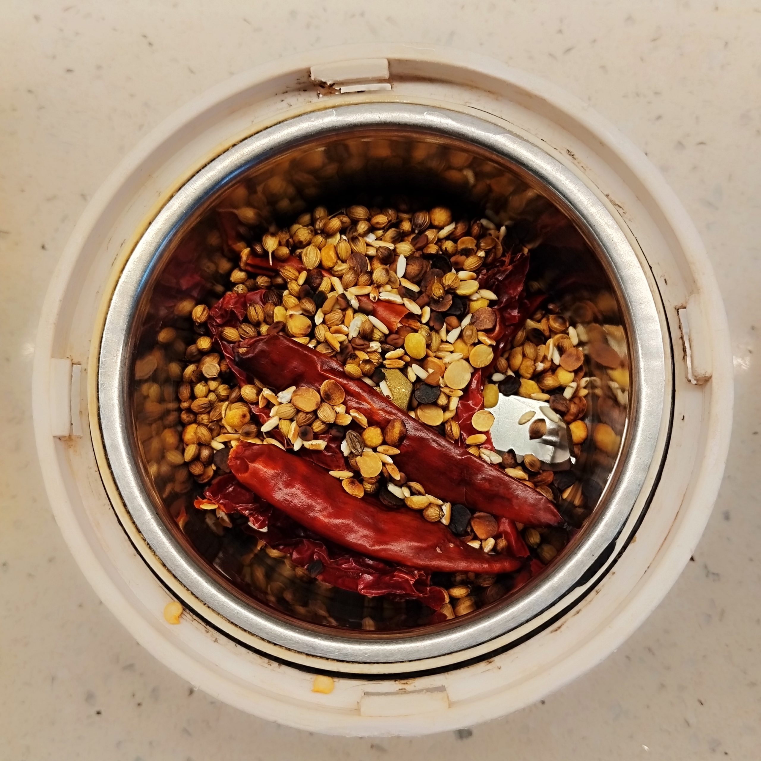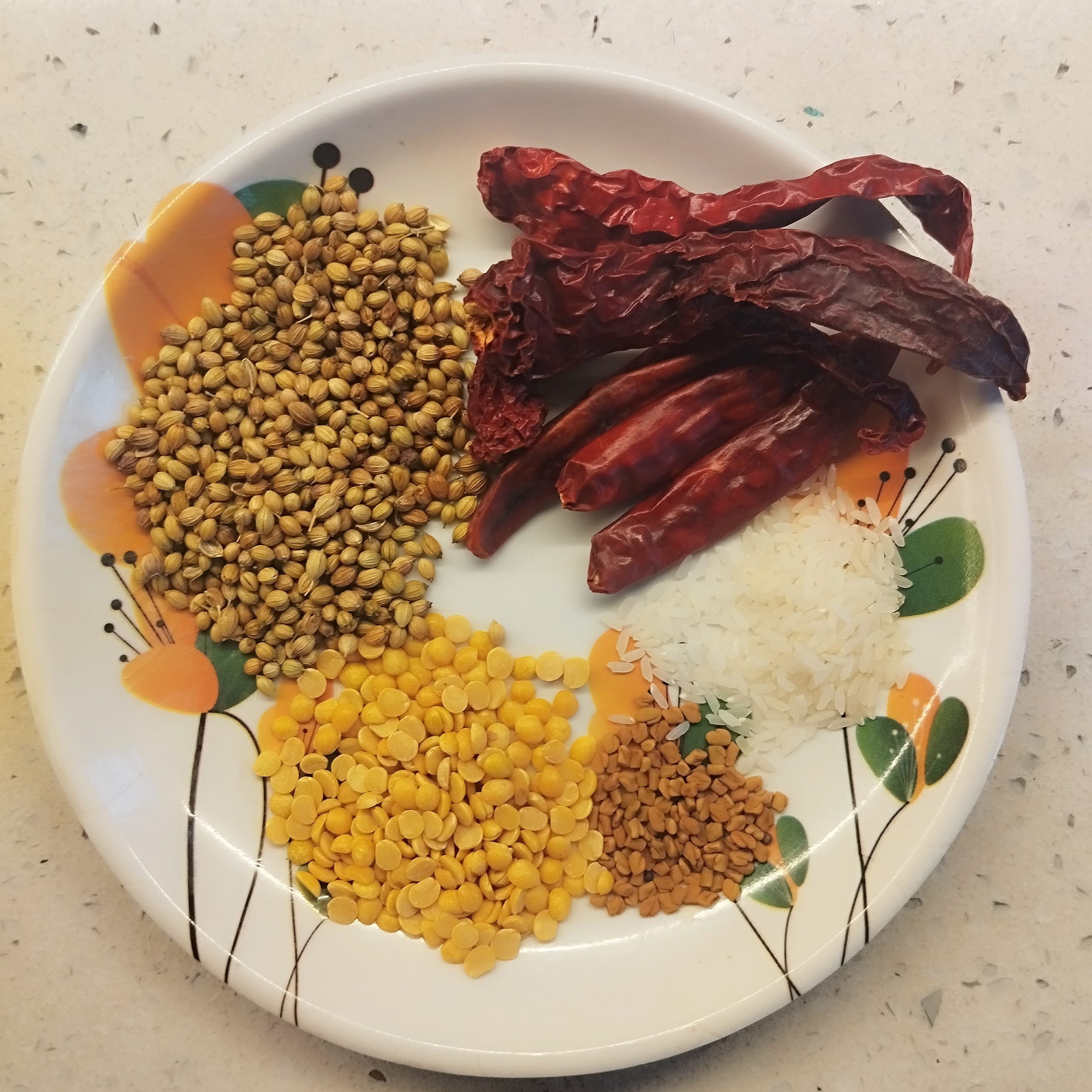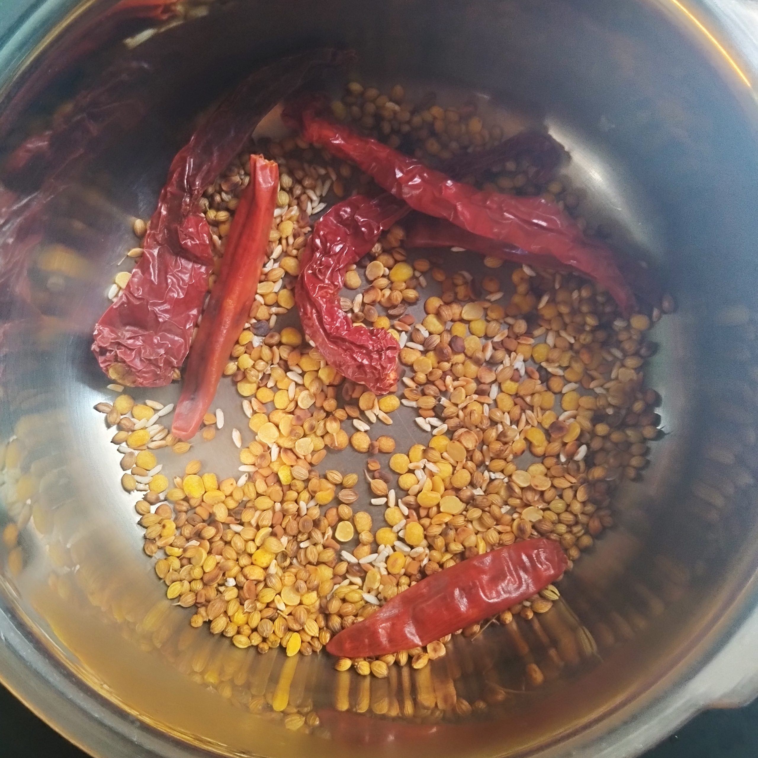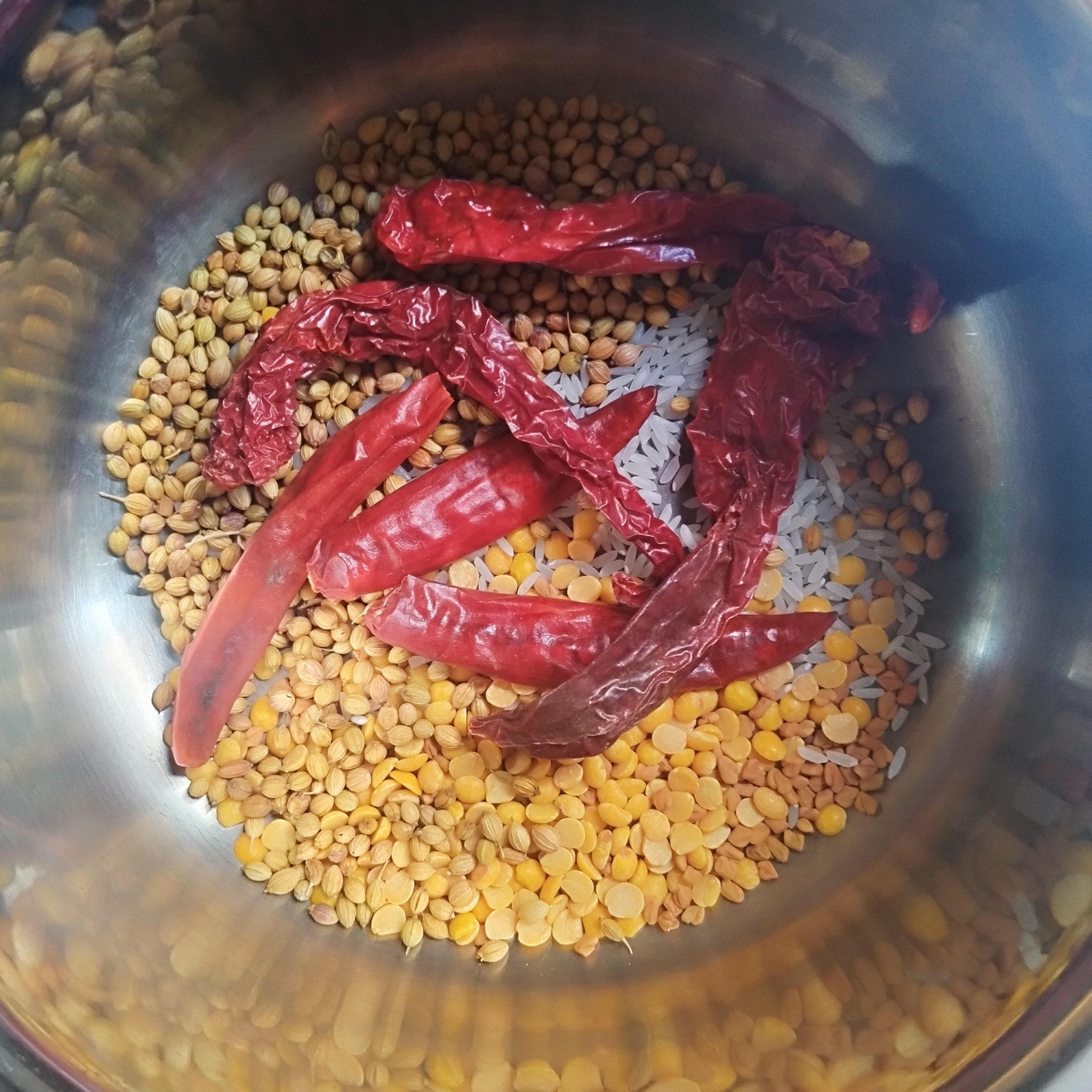 - In a pan, dry roast coriander seeds, toor dal, fenugreek (methi), raw rice, and red chilies until they turn aromatic and slightly change colour.
